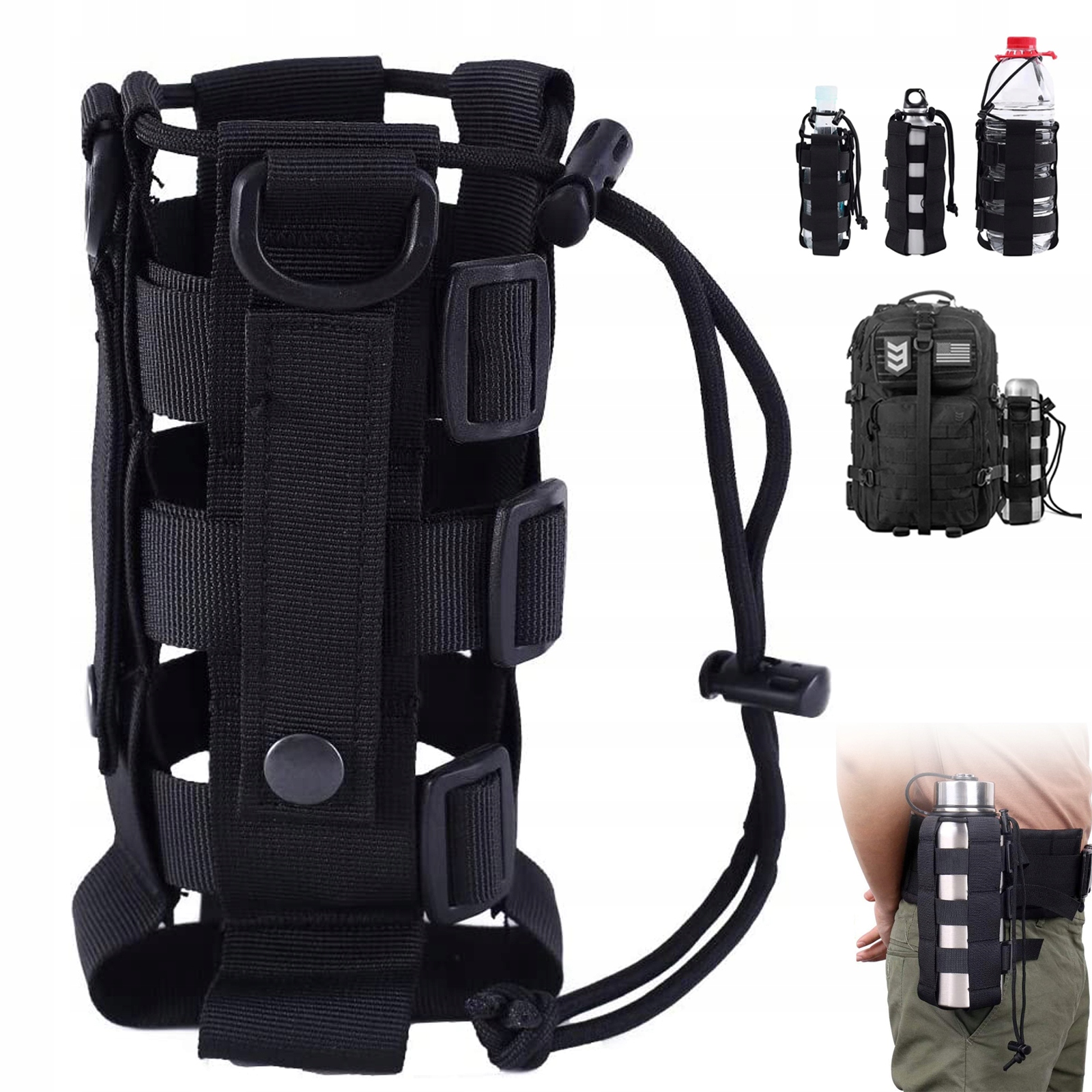 Держатель бутылки с водой Molle регулируется и подходит для большинства бутылок с водой емкостью 500–2500 мл, также можно разместить складной зонтик или небольшие EDC-инструменты.