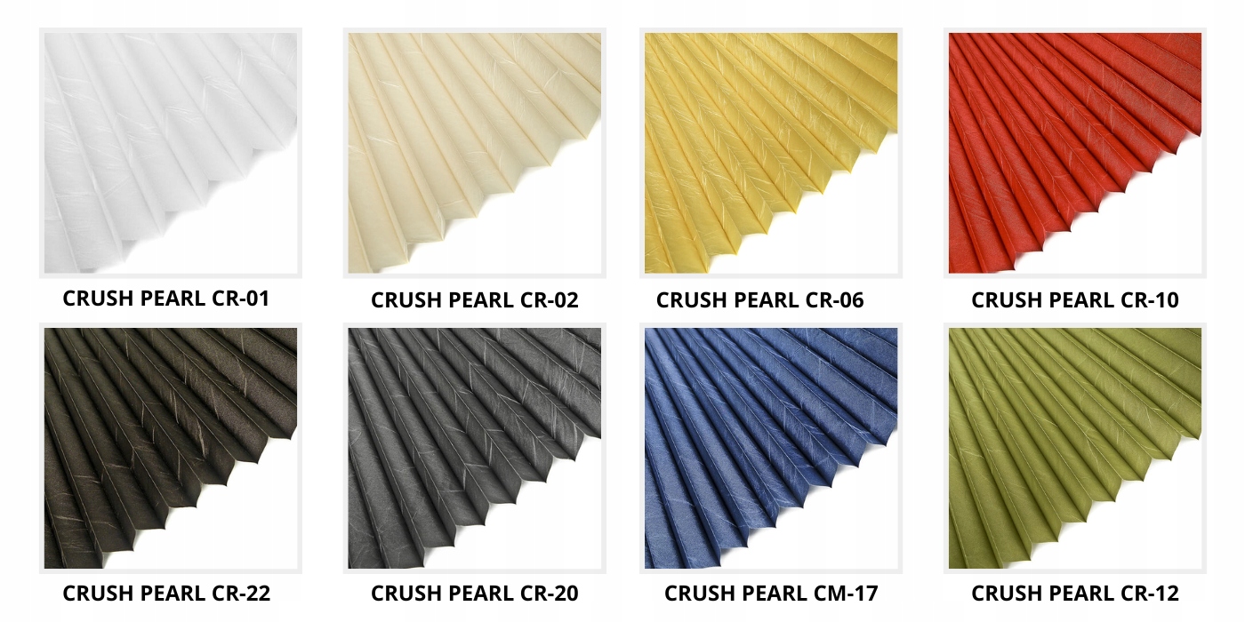 - Материалы из серии Crush имеют характерные декоративные складки на материале. На внутренней стороне материал имеет небольшой блеск. Внешняя сторона больше. Эти материалы очень декоративны и элегантно представляются на окнах. Тем не менее, их проницаемость света довольно большая и плохо выполняет функцию затемнения.