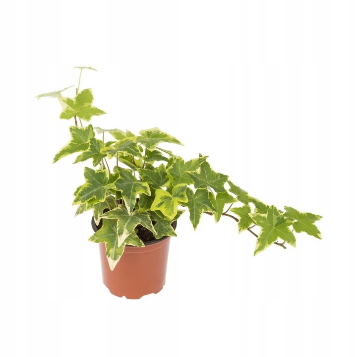 Побеги длинные, вырастают до 5-10 м. Рост можно регулировать путем прищипывания побегов, что способствует загущению формы. Стебли плюща могут свободно свисать, образуя красивые гирлянды, или цепляться за различные опоры. Коричневые, довольно жесткие стебли густо покрыты перистыми, глубоко лопастными листьями с заостренными верхушками и слегка волнистыми краями. Темно-зеленая поверхность листовой пластинки с изящно выраженными жилками дополнительно украшена более светлыми серыми прожилками и неровным белым краем.