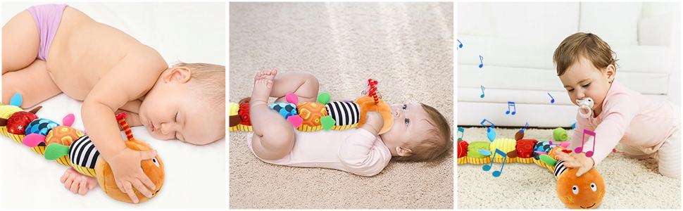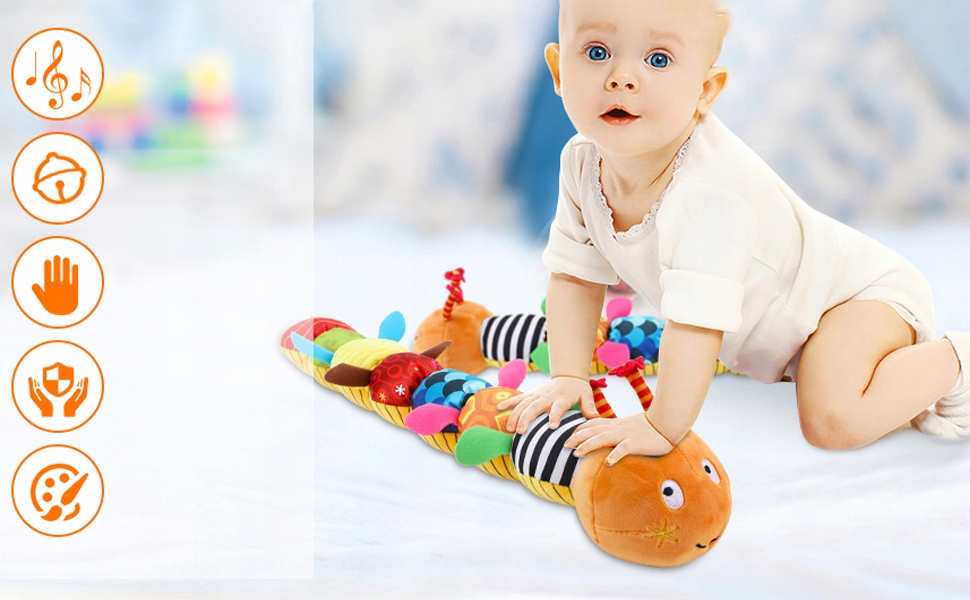 Секция 1, секция 2 и 5 плюшевого корпуса игрушки гладкие на ощупь и издают шуршащий звук , секции 3 и 6 могут издавать звуки газеты, секция 4 и хвост мягкие на ощупь, а колокольчик звонит, когда хвост покачивается. Различные прикосновения стимулируют взаимодействие и тренируют раннюю способность ребенка хватать.