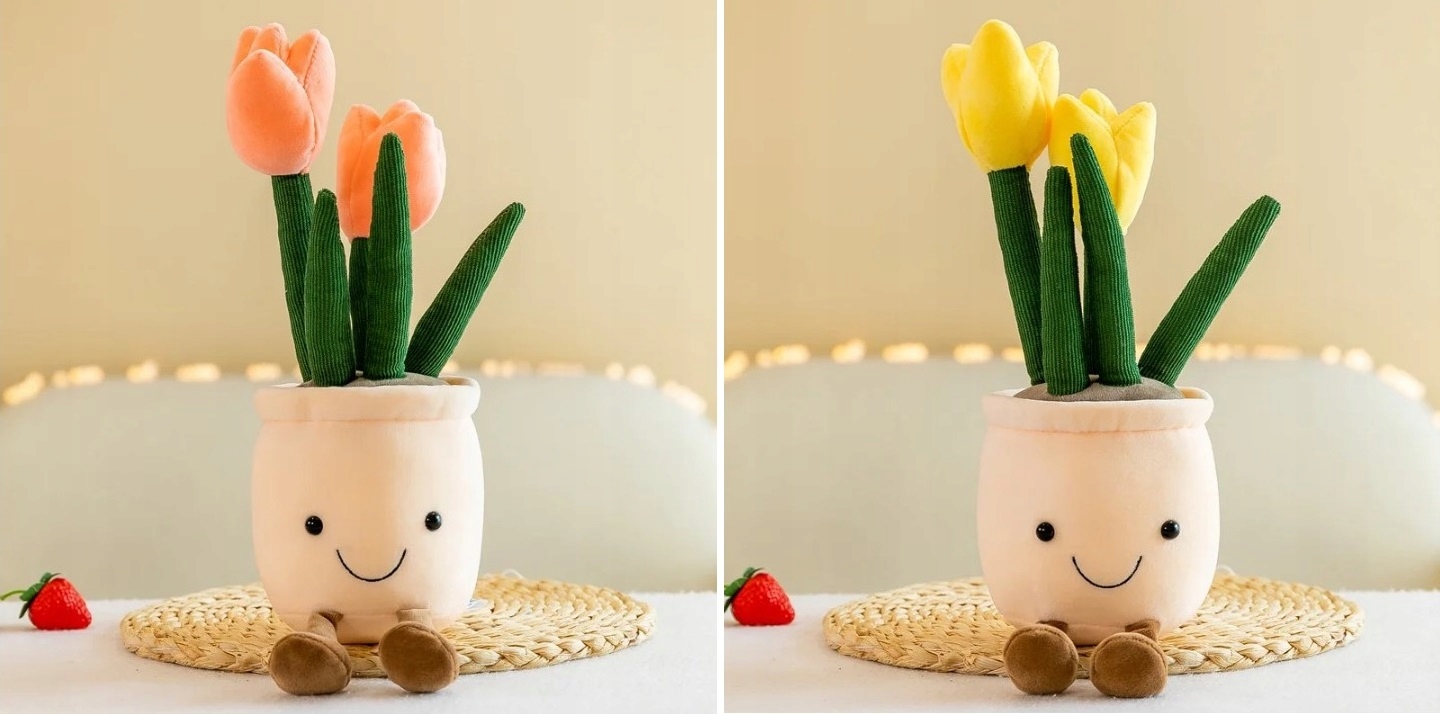 Наши плюшевые тюльпаны в горшке восторга с идеальными хлопьями, мягкими, толстыми стеблями, радостными улыбками и забавными, свободными ногами.