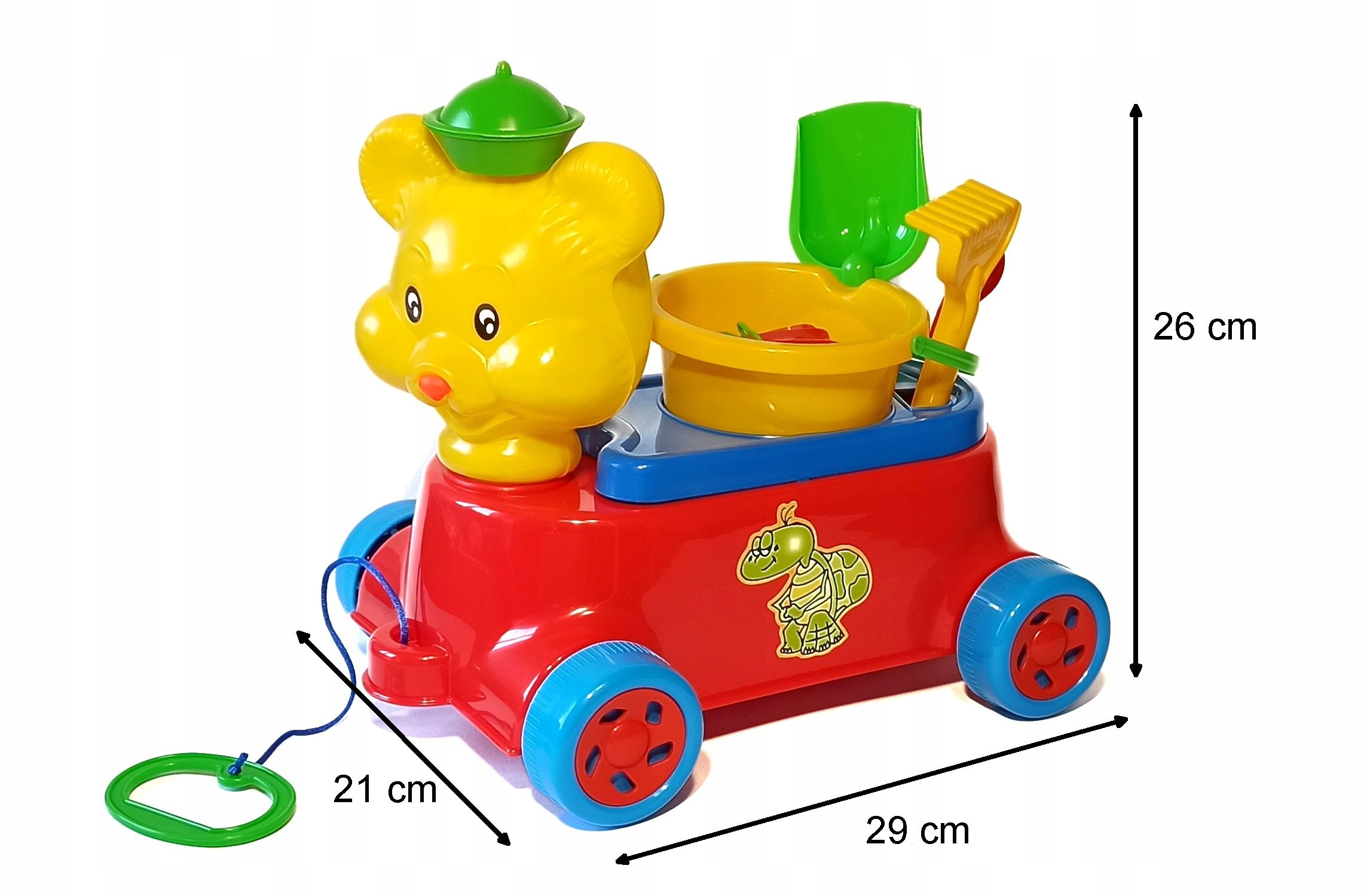 - функциональность: игрушка содержит необходимые для успешной игры в песочнице или на пляже аксессуары (ведро, лопатка, грабли и три формочки), которые после игры найдут место на спине мишки, с которым можно будет отправиться на прогулку.
