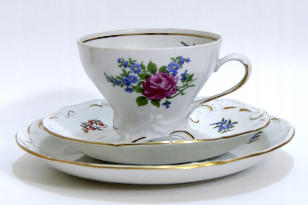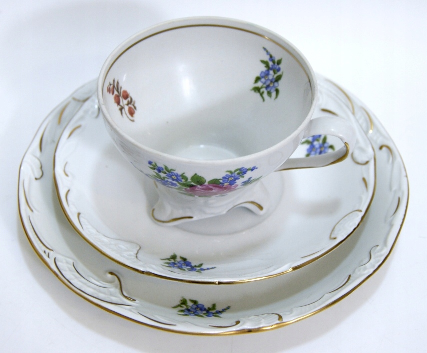 Красивый старинный сервиз из белого фарфора, украшенный цветами, рельефами и позолотой. Комплект с чашкой на ножках.