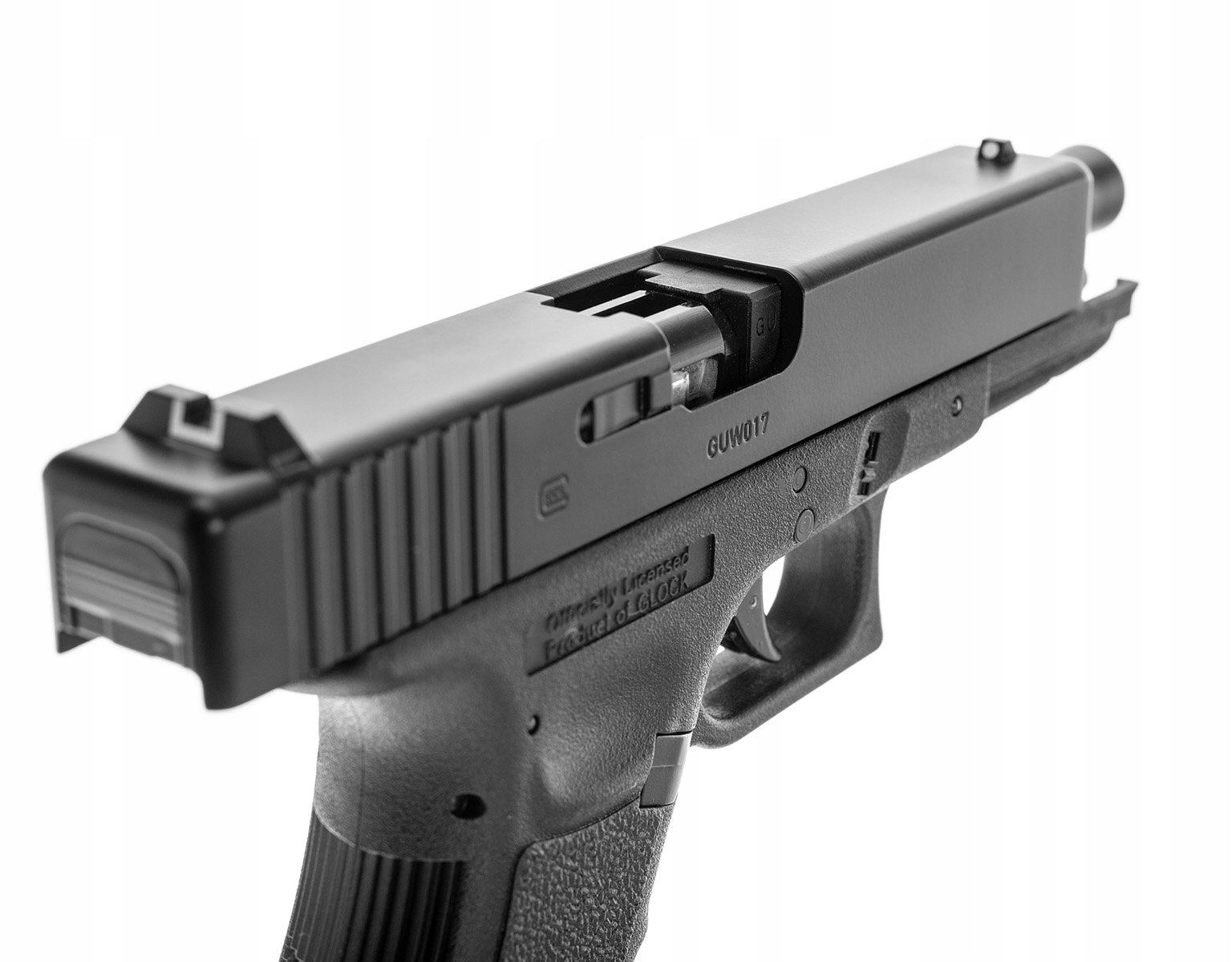 Лицензионная пневматическая винтовка самого популярного пистолета в мире - Glock 17.Пневматический пистолет изготовлен из металла и пластика - замок, ствол и внутренние элементы выполнены из металла. Пистолет и магазин имеютлицензионную маркировку производителя Glock.