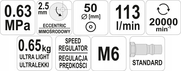 Профессиональная эксцентриковая шлифовальная машина с приводом от потока сжатого воздуха под давлением. Благодаря абразивным веществам, нанесенным непосредственно на диски, позволяет шлифовать и полировать различные виды материалов. Используется в автомобильном сервисе и промышленности.