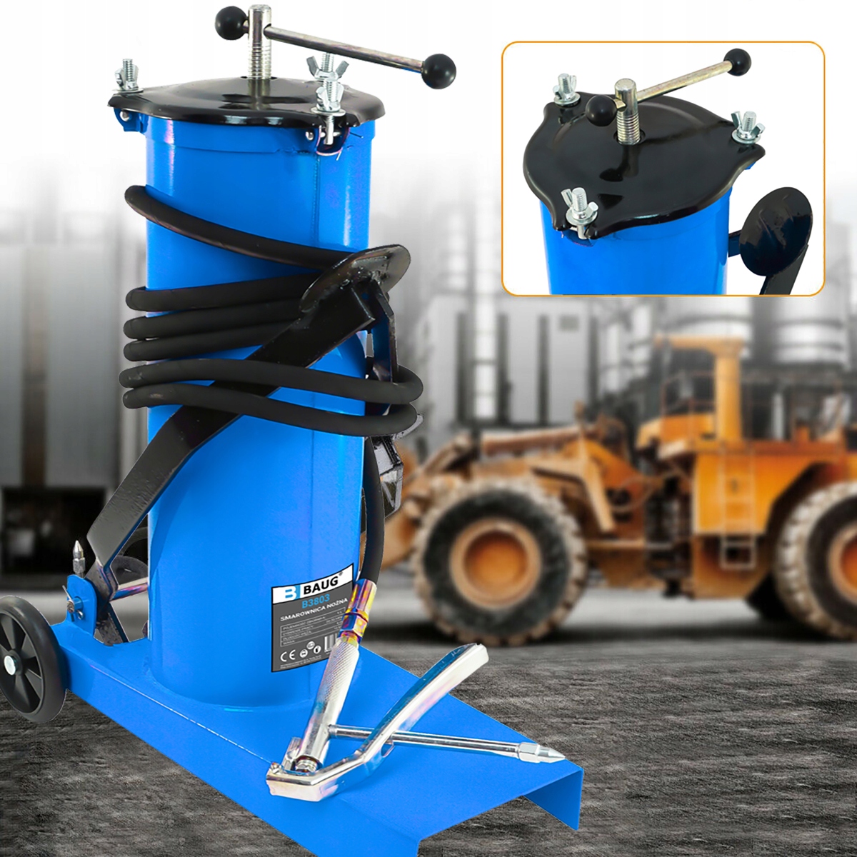 Смазочный шприц марки BAUG представляет собой устройство, используемое для смазки под давлением механических элементов, таких как валы, штифты, подшипники, шарниры и т. д. изготовлен из стального баллона емкостью 6 л, обеспечивающего непрерывную и эффективную работу. Все сделано из высококачественных материалов, устойчивых к длительному воздействию жиров и масел. Все уплотнения и клапаны изготовлены с высочайшей точностью и допускают работу при давлении до 30 МПа. В комплект входят две насадки: жесткая и гибкая, подходящая для большинства палочек. Колеса гарантируют мобильность и удобство транспортировки.