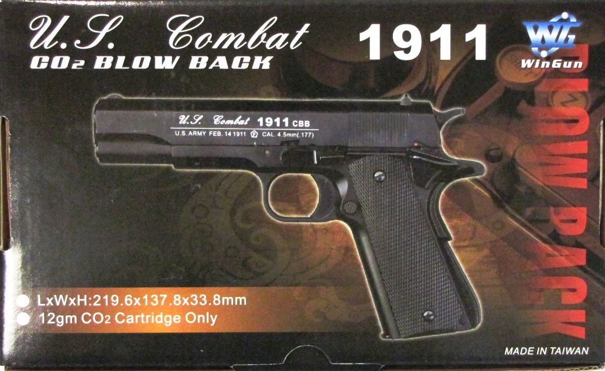 США Combat 1911 CBB — газопневматический пистолет, созданный на основе военной версии Colt 1911. Он полностью выполнен из металла, за исключением накладки рукояти из перфорированного АБС-пластика, благодаря чему оружие исключительно хорошо лежит в руке. Он стреляет только стальными шариками калибра 4,5 мм (точнее, 4,46 мм) — свинцовые боеприпасы использовать нельзя! Он оснащен картриджем с CO2 массой 12 г, который позволяет сделать до 60 мощных выстрелов. Пистолет идеально подходит для развлечений и соревнований по стрельбе.