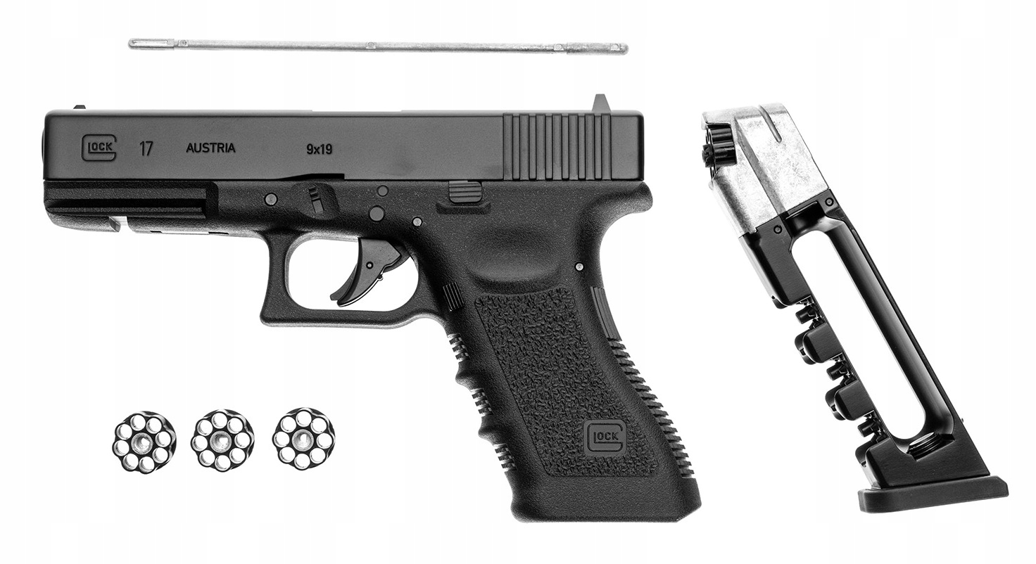 Glock 17 со свободным затвором 4,5 мм BB/Diabolo CO2 — пневматический пистолет с мощной системой свободного затвора, стреляющий пулями диаболо и BB, оснащенный металлический замок, дополнительный предохранитель и ряд конструктивных решений, заимствованных у огнестрельного оружия.