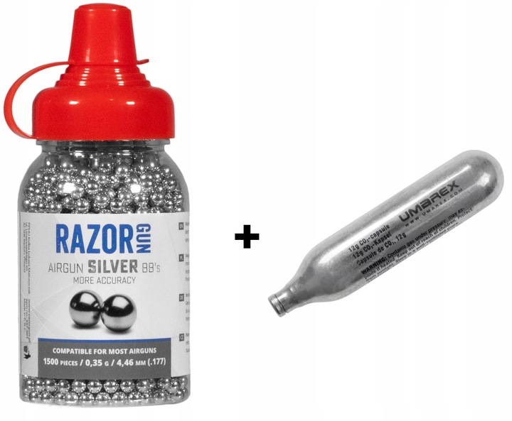 Капсулы CO2 12 г от UMAREX и упаковка из 1500 круглых BB-пеллет.