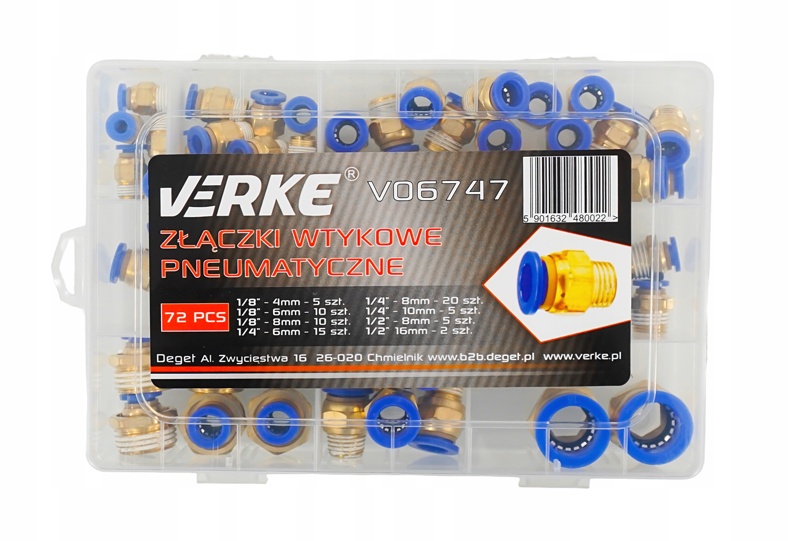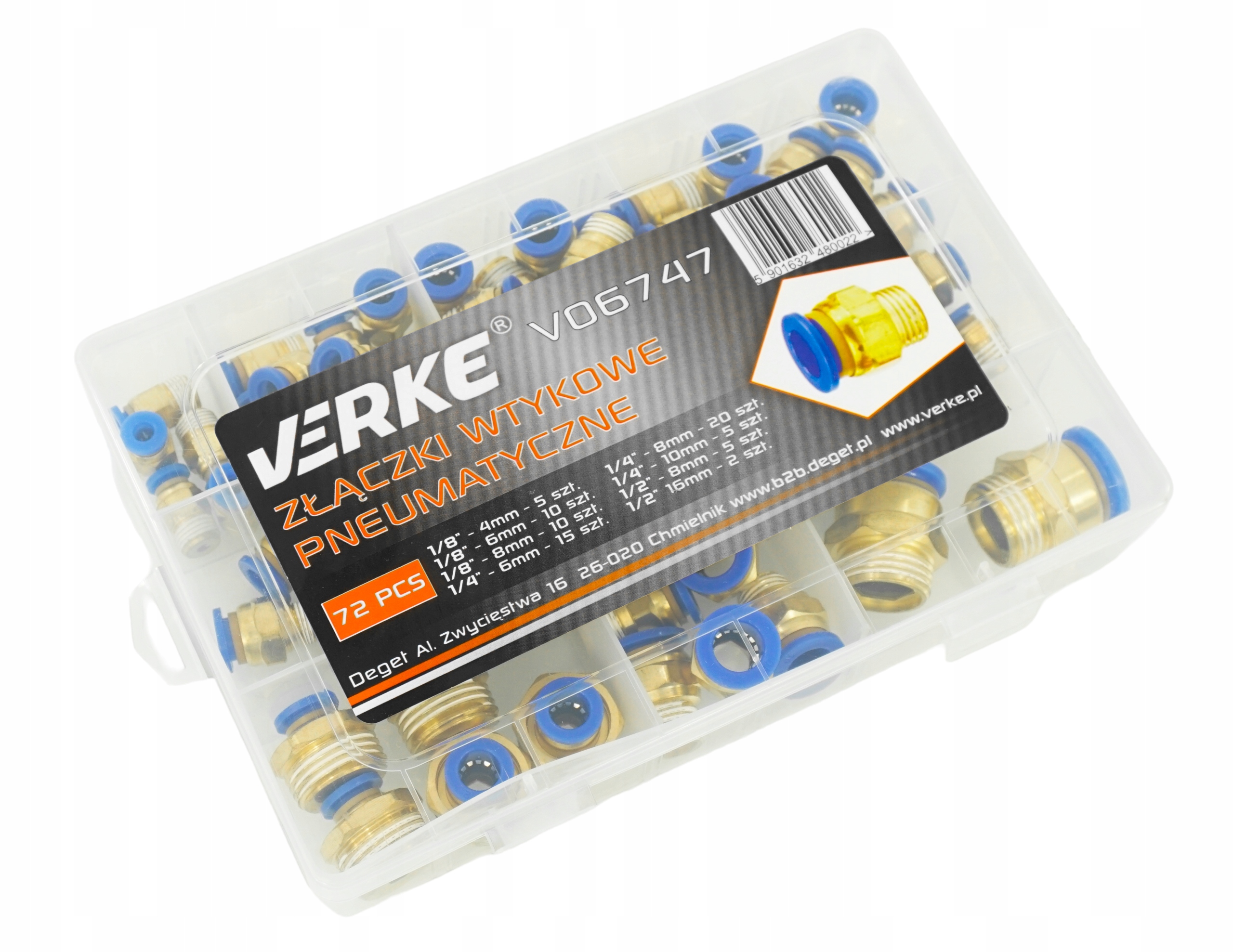 Набор пневматических быстроразъемных соединений Verke представляет собой комплексный набор из 72 элементов, который значительно облегчает создание, модификацию и обслуживание пневматических установок. Благодаря разнообразию размеров и резьб набор хорошо подойдет как для профессиональных мастерских, так и для домашнего творчества. Практичный транспортировочный ящик позволяет держать все в порядке и легко идентифицировать отдельные элементы.
