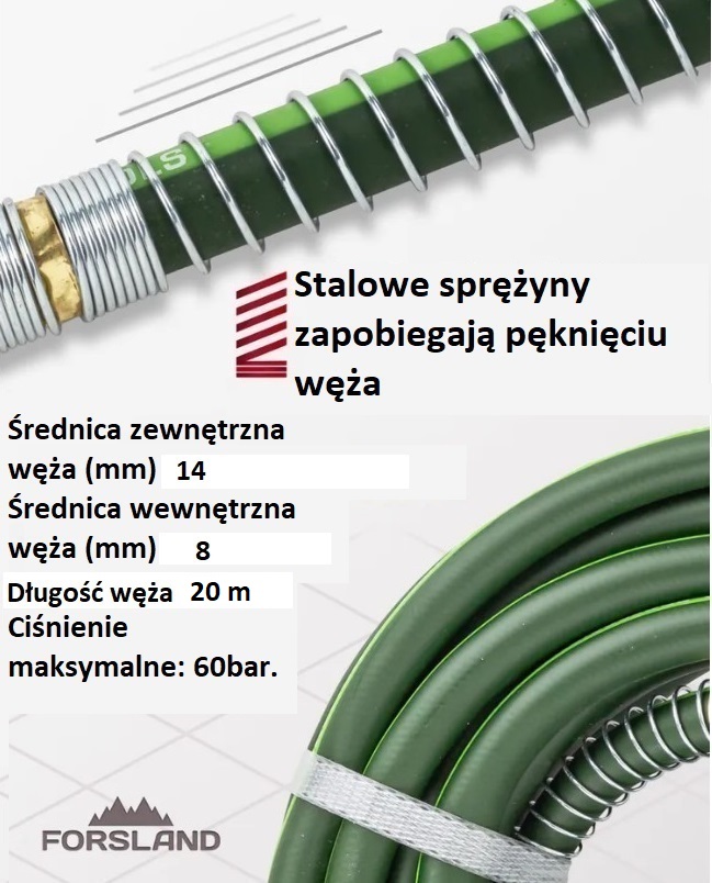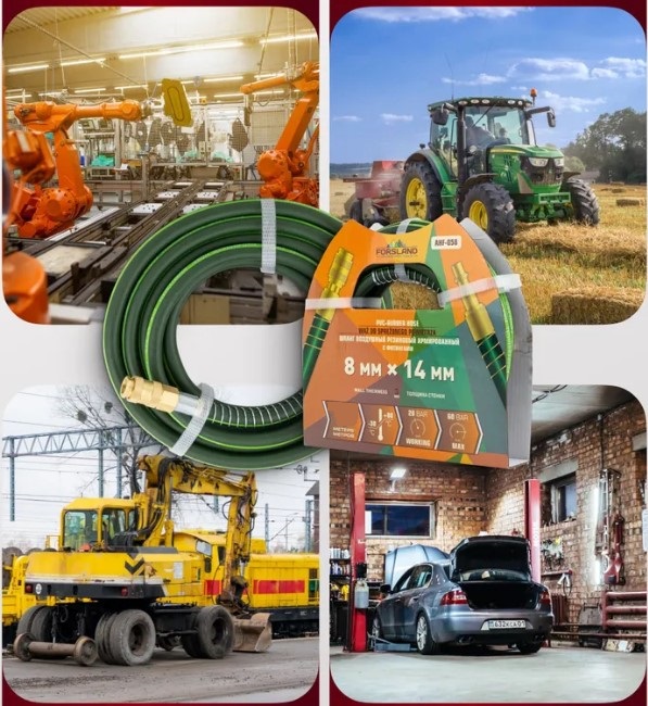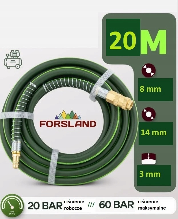 Резиновый, армированный пневматический шланг для компрессора с разъемами 8 мм x 14 мм- 20 м от Forsland используется для подключения пневматических инструментов к компрессору при работе с сжатым воздухом. Пневматический шланг изготовлен из армированной резины, устойчивой к износу. Полимерная крышка выдерживает повторное использование без разрыва, обеспечивая таким образом стеснение и долгую жизнь. Пневматический шланг с высоким давлением оснащен дополнительной защитой в виде стальных пружин, которые предотвращают растрескивание змеи в точках монтажа, с внутренним диаметром 8 мм и внешним диаметром 14 мм. Также благодаря укреплению продукт выдерживает высокое давление сжатого воздуха до 60 бар, рабочее давление 20 бар. Толщина стенки шланга составляет 3 мм, что обеспечивает ее высокую механическую прочность и долговечность. Быстрые муфты изготовлены из латуни, устойчивой к коррозии и деформации. Комбинация быстрых соединений обеспечивает удобство и долговечность. Быстрая соединительная область усиливается, чтобы избежать изгибов и трещин.