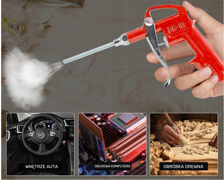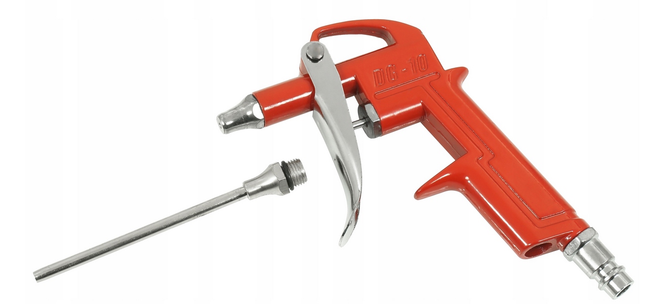 Пистолет -выдувки используется для очистки с помощью потока сжатого воздуха грязных поверхностей. Благодаря длинной сопло можно работать с пистолетом в тяжелых местах. Необходимо на каждом заводе и обслуживании.