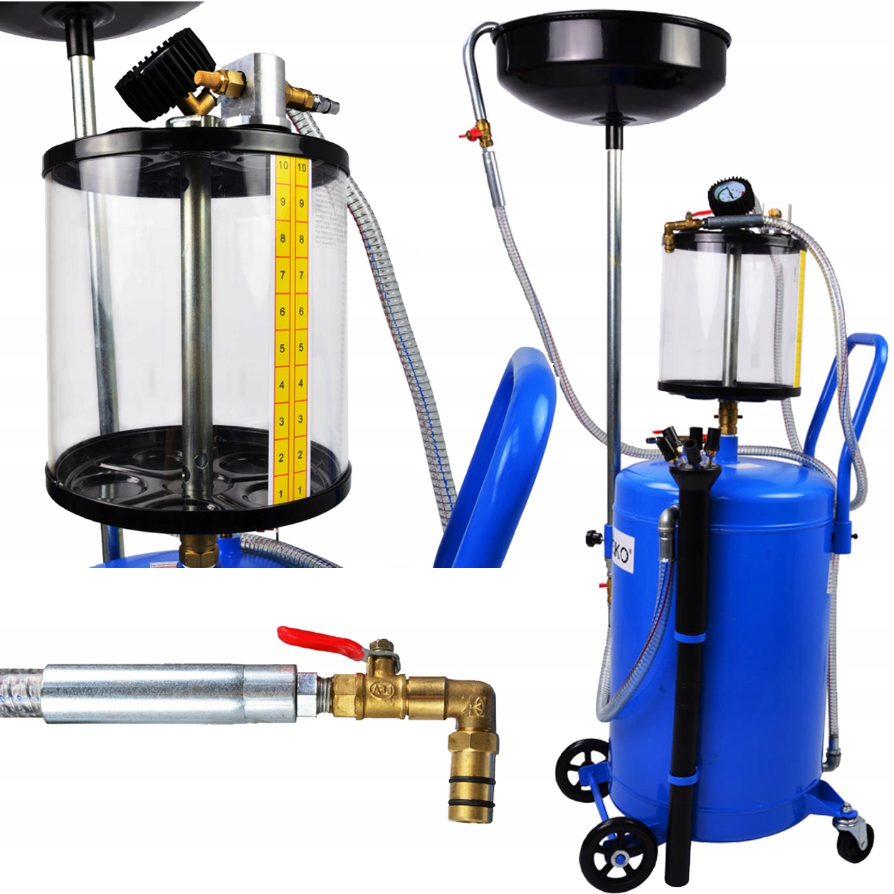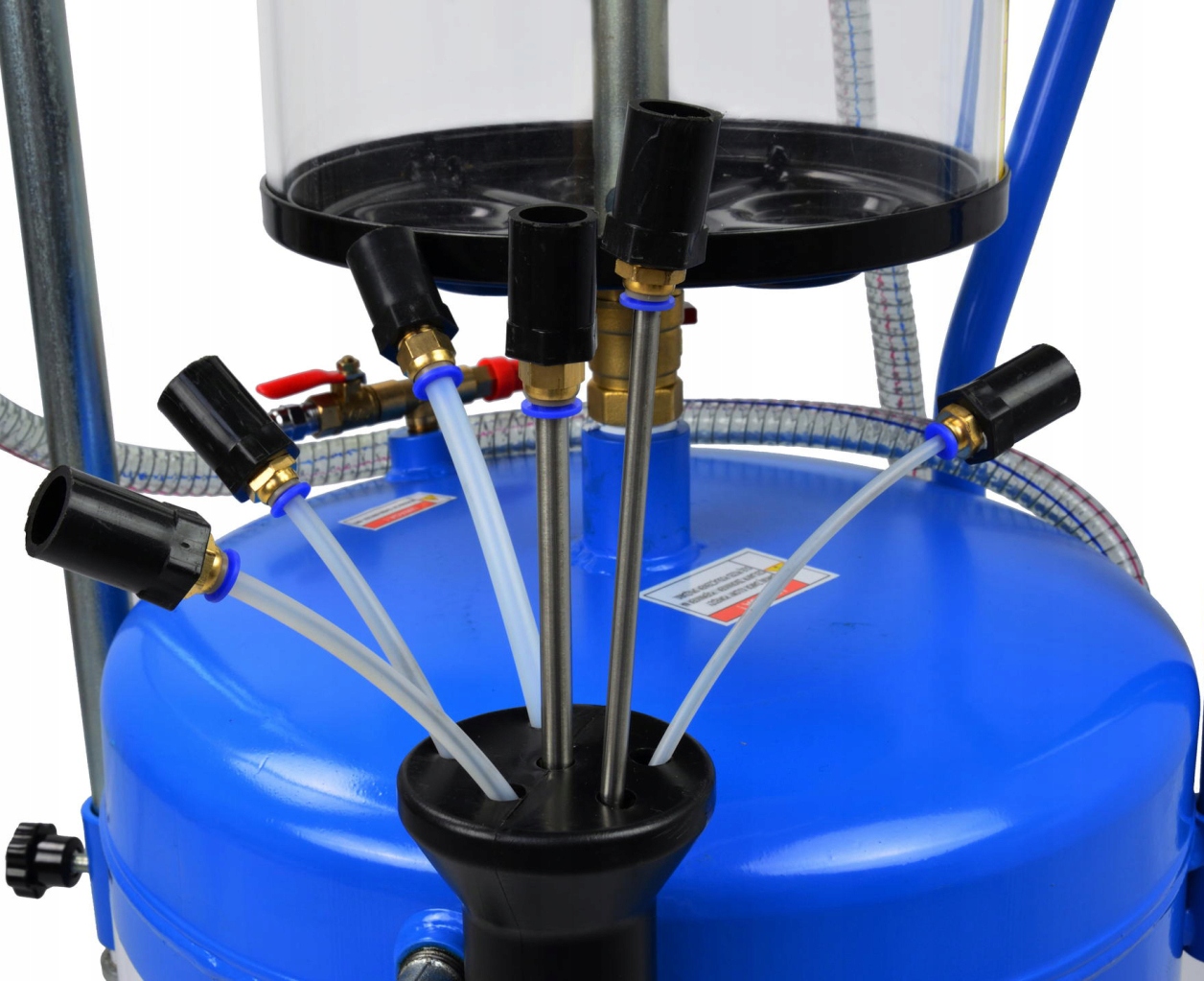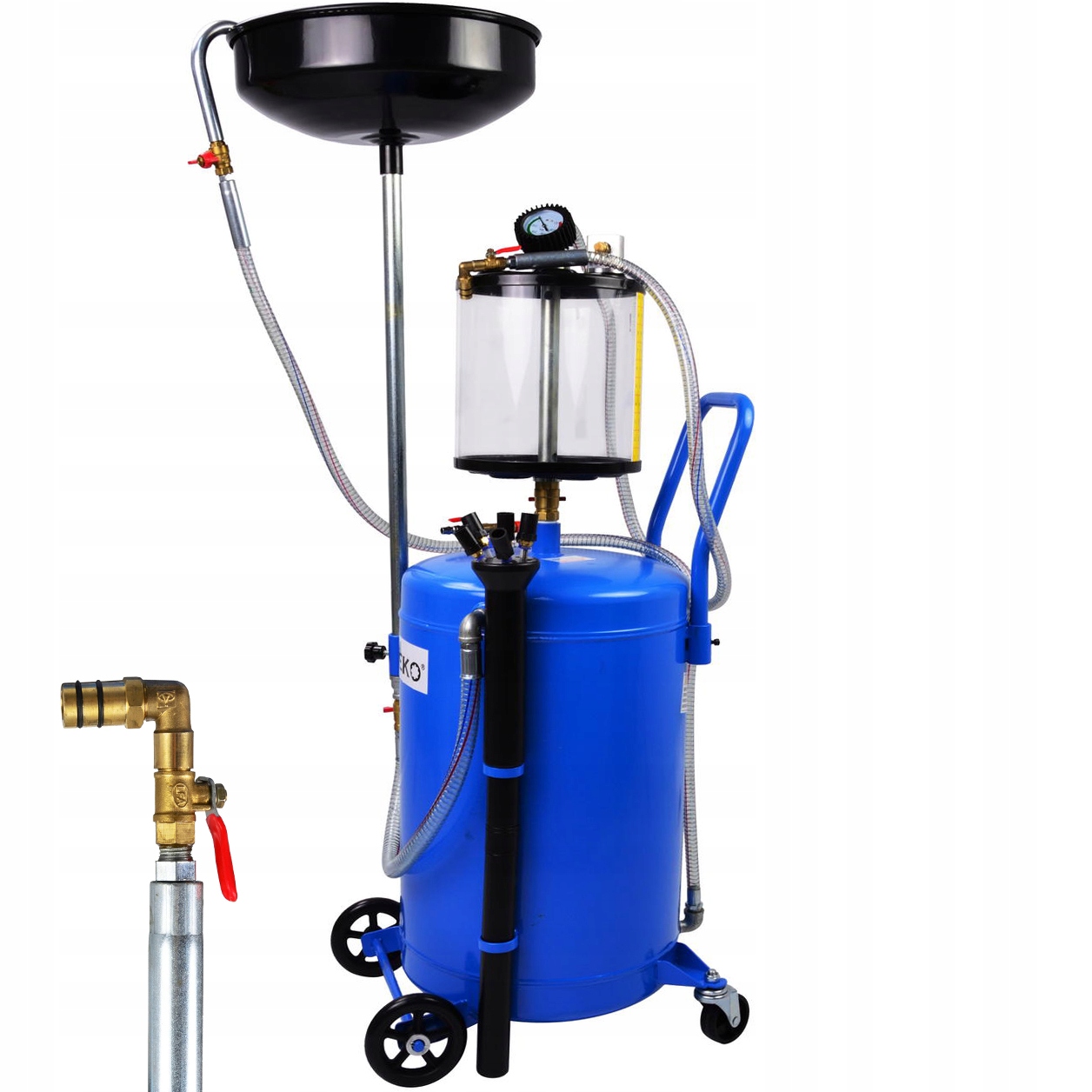 Профессиональный пневматический маслоотделитель, оснащенный баком емкостью 80 литров и набором из 6 всасывающих зондов.