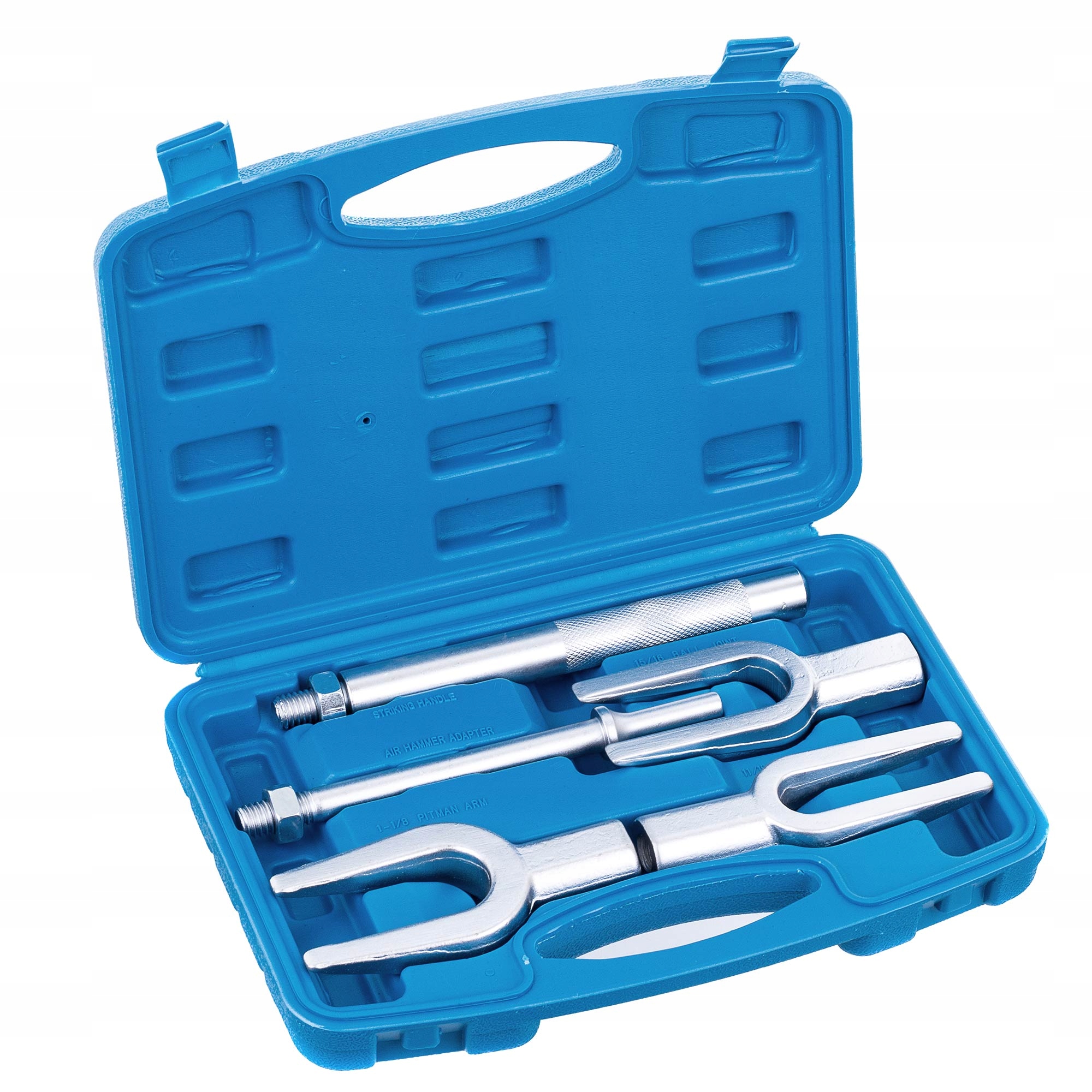 Форки, изготовленные из высококачественной стали. Руки вилки в Welt имеют прочные и даже клиновые поверхности, которые позволяют легко и точное укрепление защищенных булавок и стержней. Съемник адаптирован для работы с пневматическим или ручным молотком. Набор помещен в практическое пластиковое чемодан.