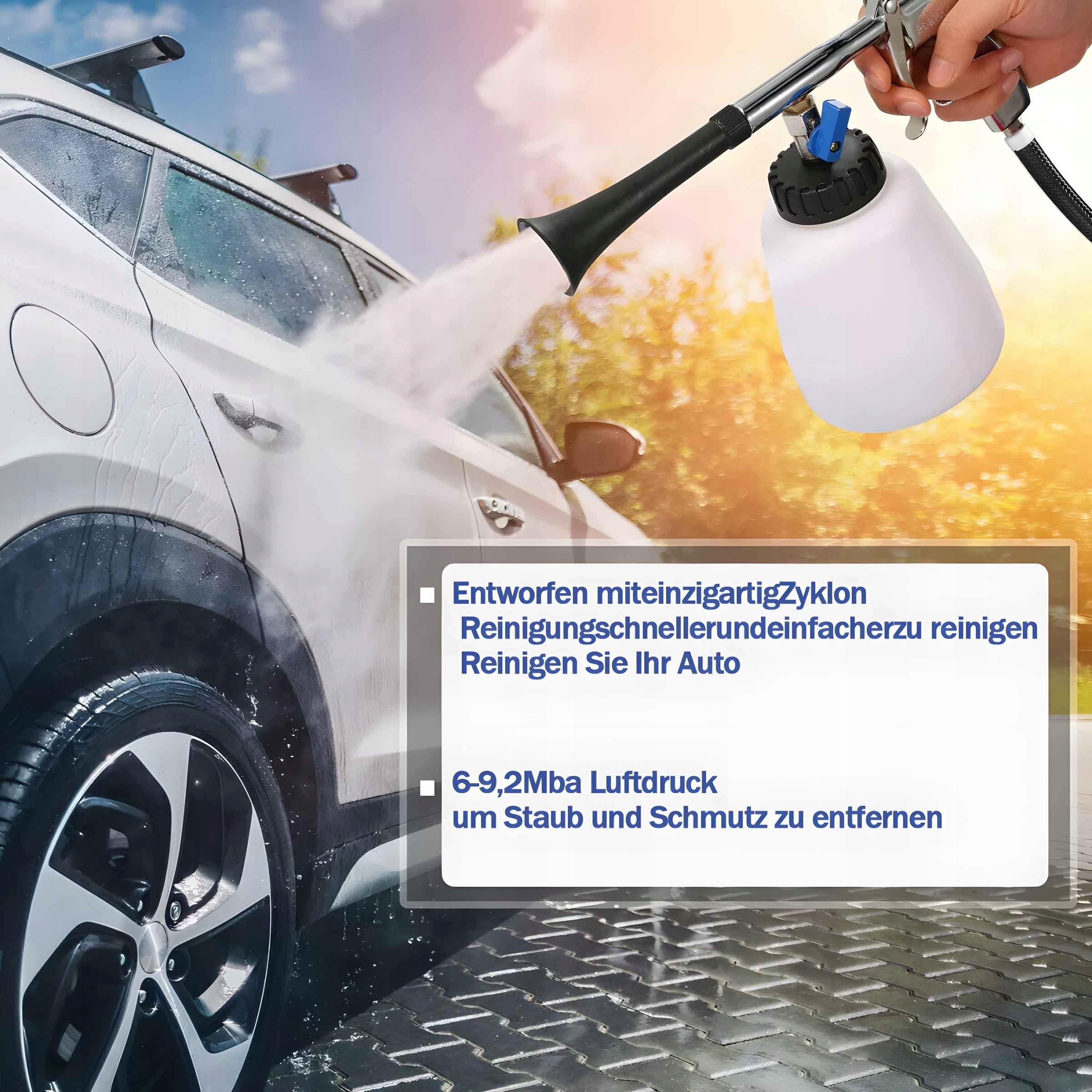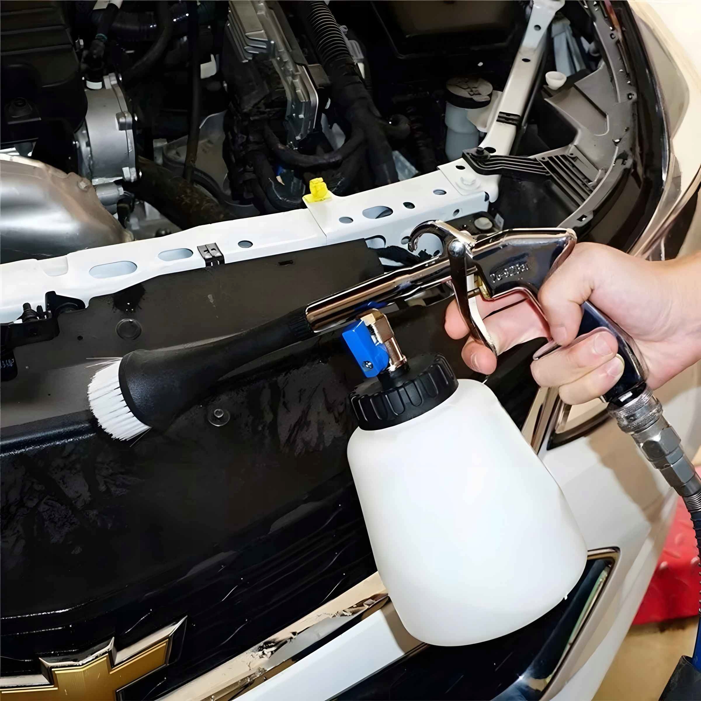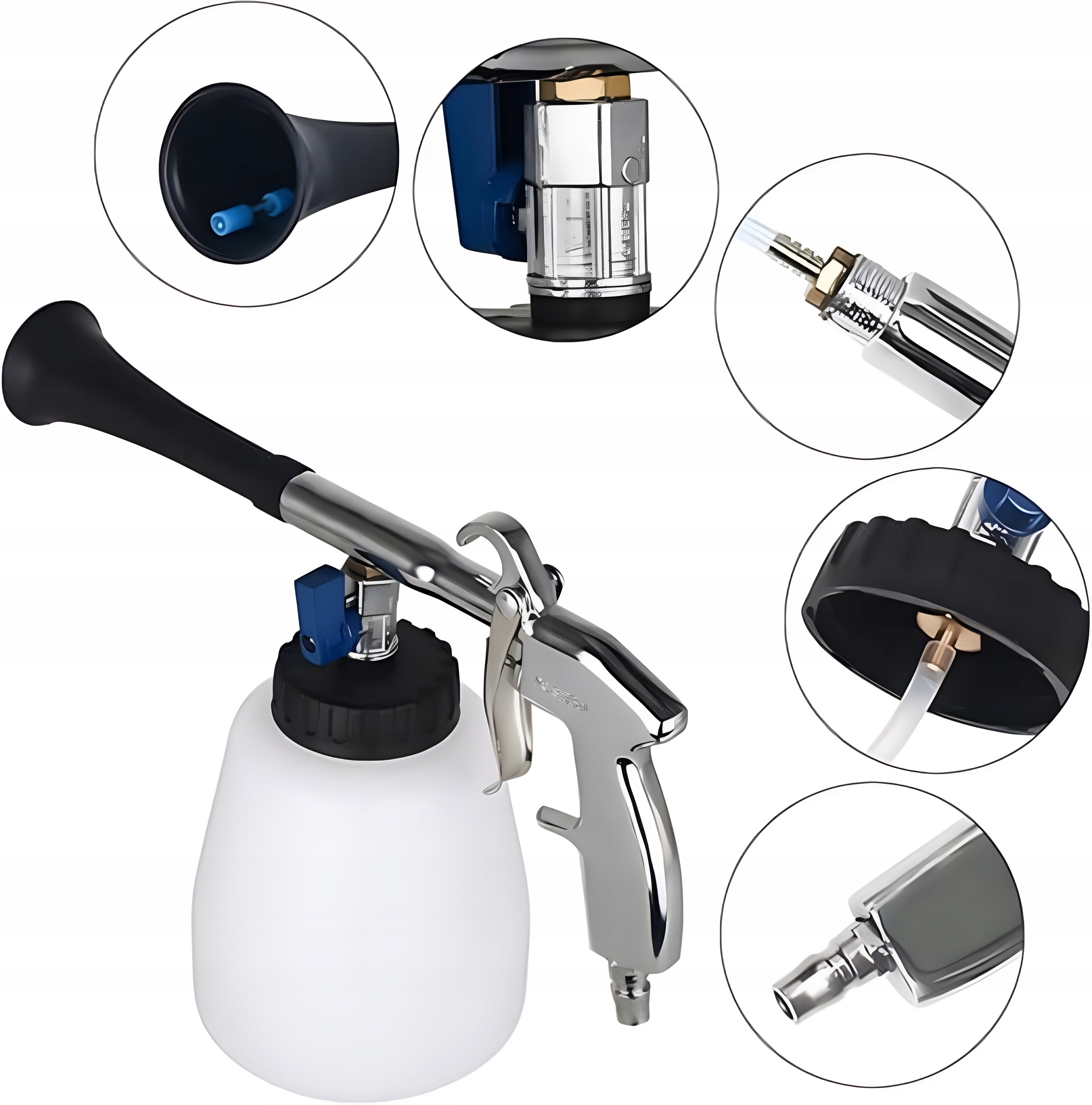 Предназначен для любителей и профессионалов, пистолет для влажной уборки грязи с кузова и салона автомобиля, в том числе: воздухозаборников, кондиционера, зеркальных и пластиковых элементов, сидений, обивки салона, ковров, грязи и трудноудаляемых загрязнений. Благодаря насадке особой формы с вращающимся сердечником пистолет под воздействием сжатого воздуха производит пенистый чистящий раствор, который очищает все элементы, лишь слегка смачивая их! Это очень эффективное устройство, оно использует минимальное количество воды и чистящих средств. Он доходит до всех труднодоступных мест и щелей, куда не может добраться обычная губка, тряпка, кисточка или кисточка!!! Идеально подходит для коммерческой чистки различных типов поверхностей, таких как обивка, мебель, диски, воздуховоды и т. д. Для работы не требуются мощные компрессоры, достаточно давления в 5 бар. Пистолет имеет регулируемую дозировку химикатов, что позволяет подстраивать раствор под очищаемую поверхность.