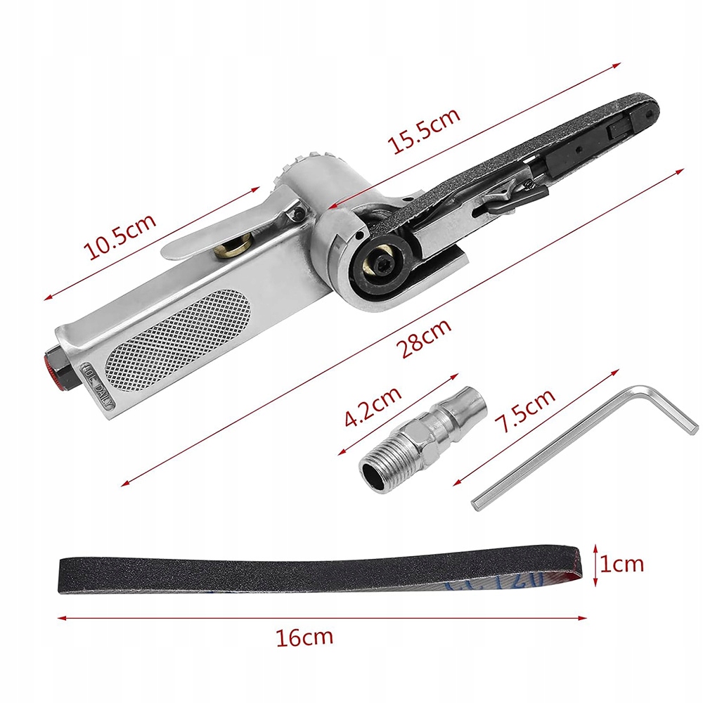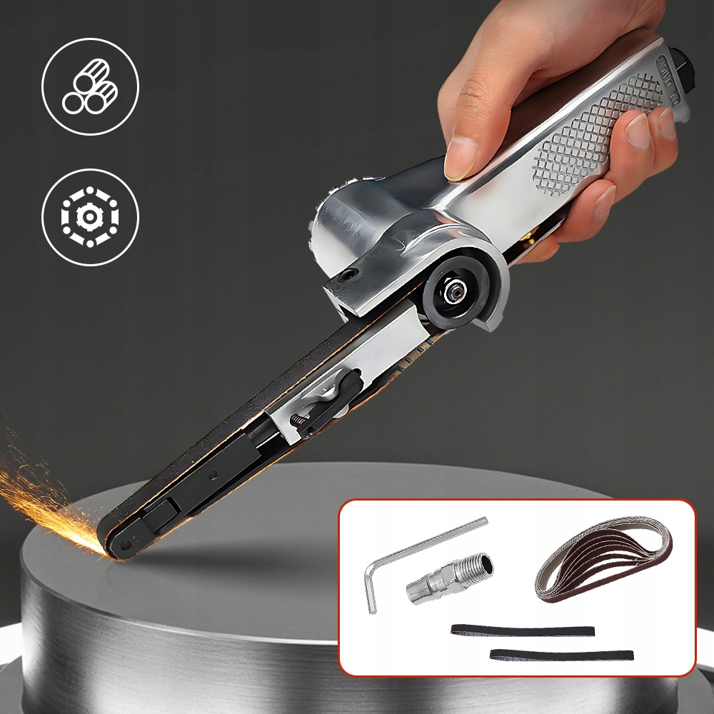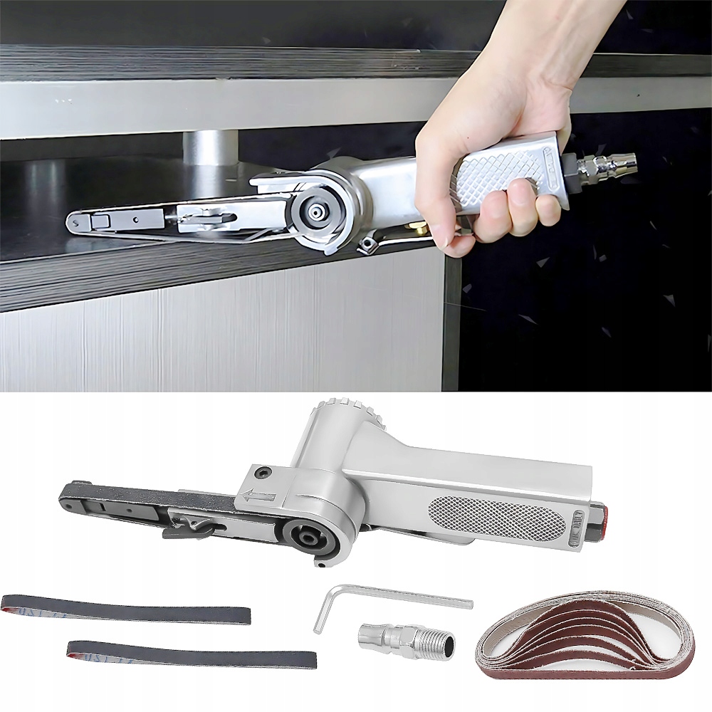 Пневматическая пневматическая шлифовальная шлифовка - это профессиональный пневматический инструмент, который использует непрерывное движение абразивной ленты для измельчения и полировки различных типов поверхностей. Модель, которую вы описываете, отличается компактной структурой, напоминающей резервуар, который обеспечивает стабильность во время работы. Устройство питается с помощью сжатого воздуха, что позволяет его работать в местах, где доступ к электричеству.