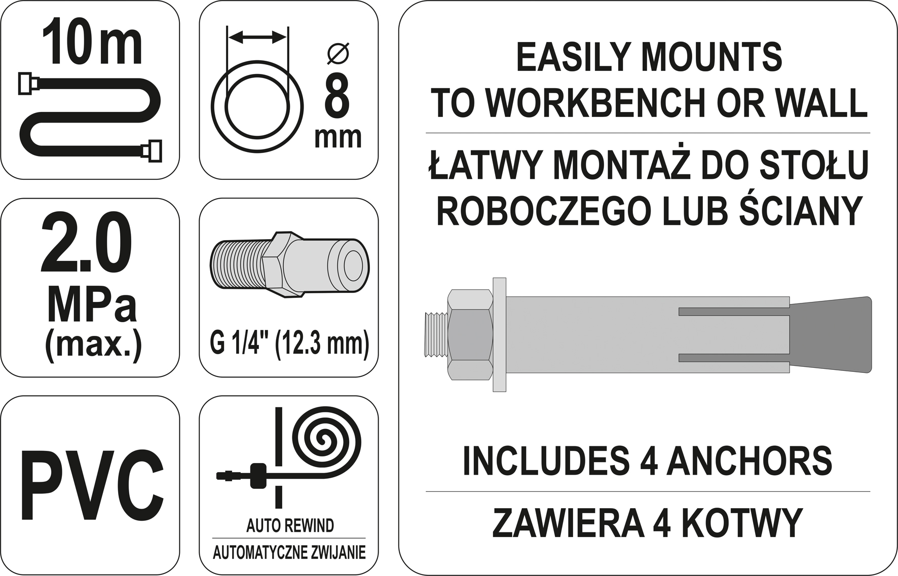 Пневматический кабель Yato YATO YT-24242 доступен в автоматическом корпусе роликов , который обеспечивает хорошую защиту кабеля и удобство использования, а прикрепленные якоря позволяют легко установить к рабочим или стене.