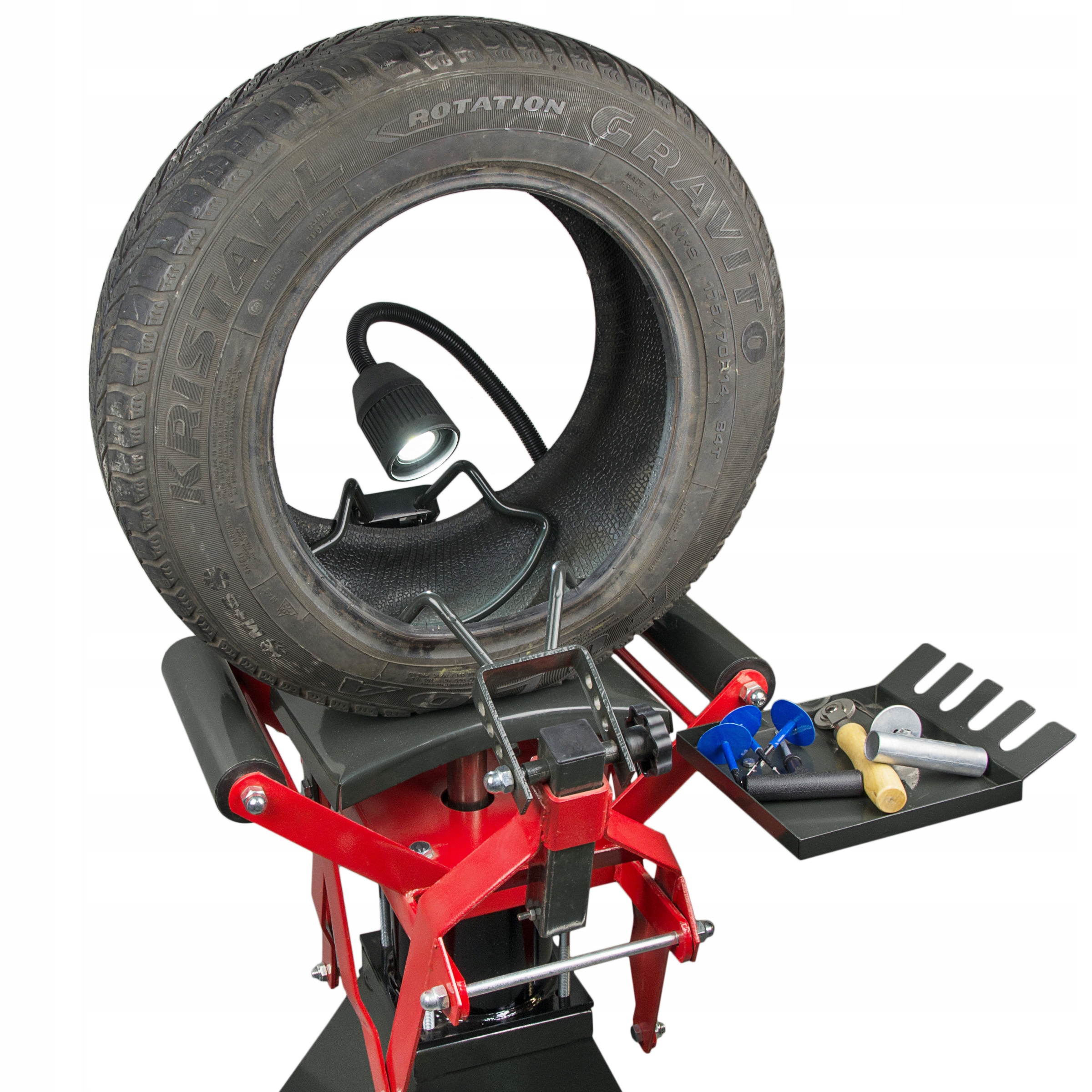 Разбрасыватель ПНЕУПРО – это профессиональная станция по ремонту пневматических шин. Питание осуществляется сжатым воздухом с рабочим давлением 6–8 бар через быстроразъемный евроразъем. Он позволяет устойчиво закрепить шину и развести ее бока для удобного доступа к поврежденному участку. Все, что вам нужно сделать, это разместить шину между роликами, установить крюки расширения и активировать механизм расширения. Борта шины будут расширяться за счет встроенного в устройство пневмопривода.