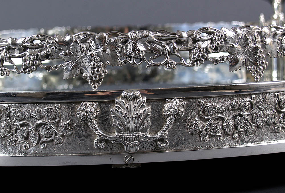 в виде большой круглой зеркальной поверхности, опирающейся на четыре ножки. Зеркало, обрамленное полосой, по периметру которой выгравированы усики растений, и четыре корзины с фруктами. Нижняя и верхняя части полосы плоские, полированные. Над зеркальной поверхностью расположена ажурная репуссированная галерея в виде полированных лоз, соединенных вместе с плодами винограда, окруженными все более мелкими и крупными листьями. Все держится на четырех симметрично расположенных ножках, суженных книзу и отдельной ступней. Растительные аппликации прикрепляются к гладким рукавообразным поверхностям. В верхней части ножки имеется съемный точеный стержень, более широкий вверху, на котором удерживается чашка, в данном случае хрустальная чаша с глубоким вырезом и неровным воротником. Дно соединено двумя перекрещенными планками, с ножкой посередине и деревянной панелью. Все в отличном состоянии, зеркало оригинальное, с небольшими следами использования.
