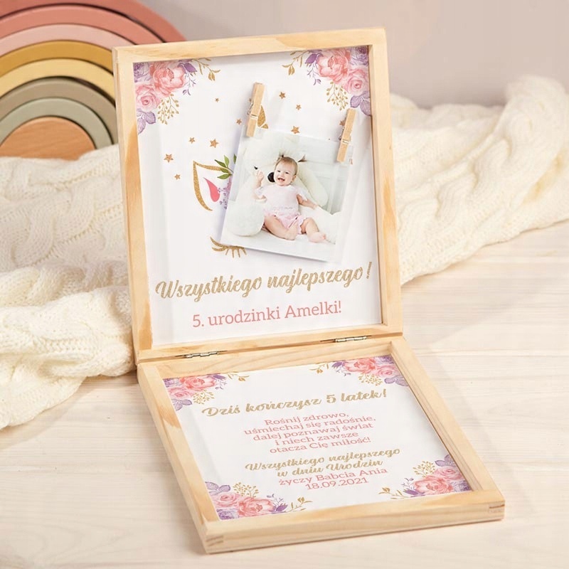 Коробка с пожеланиями на день рождения и местом для сувенирной фотографии или денег – отличное дополнение к подарку ребенку на день рождения. Открытка на день рождения в деревянной коробке – прекрасный способ подарить ребенку деньги. Пожелания с мотивом единорога порадуют каждую девушку.