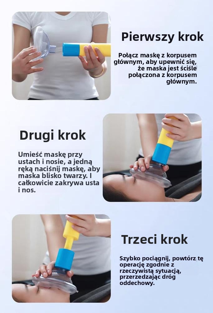Потяните за ручку и поршень, прикрепив маску к лицу пострадавшего. Если препятствие не устранено с первого раза, продолжайте нажимать и тянуть ручку и поршень, не снимая маску с лица пострадавшего, пока препятствие не будет устранено