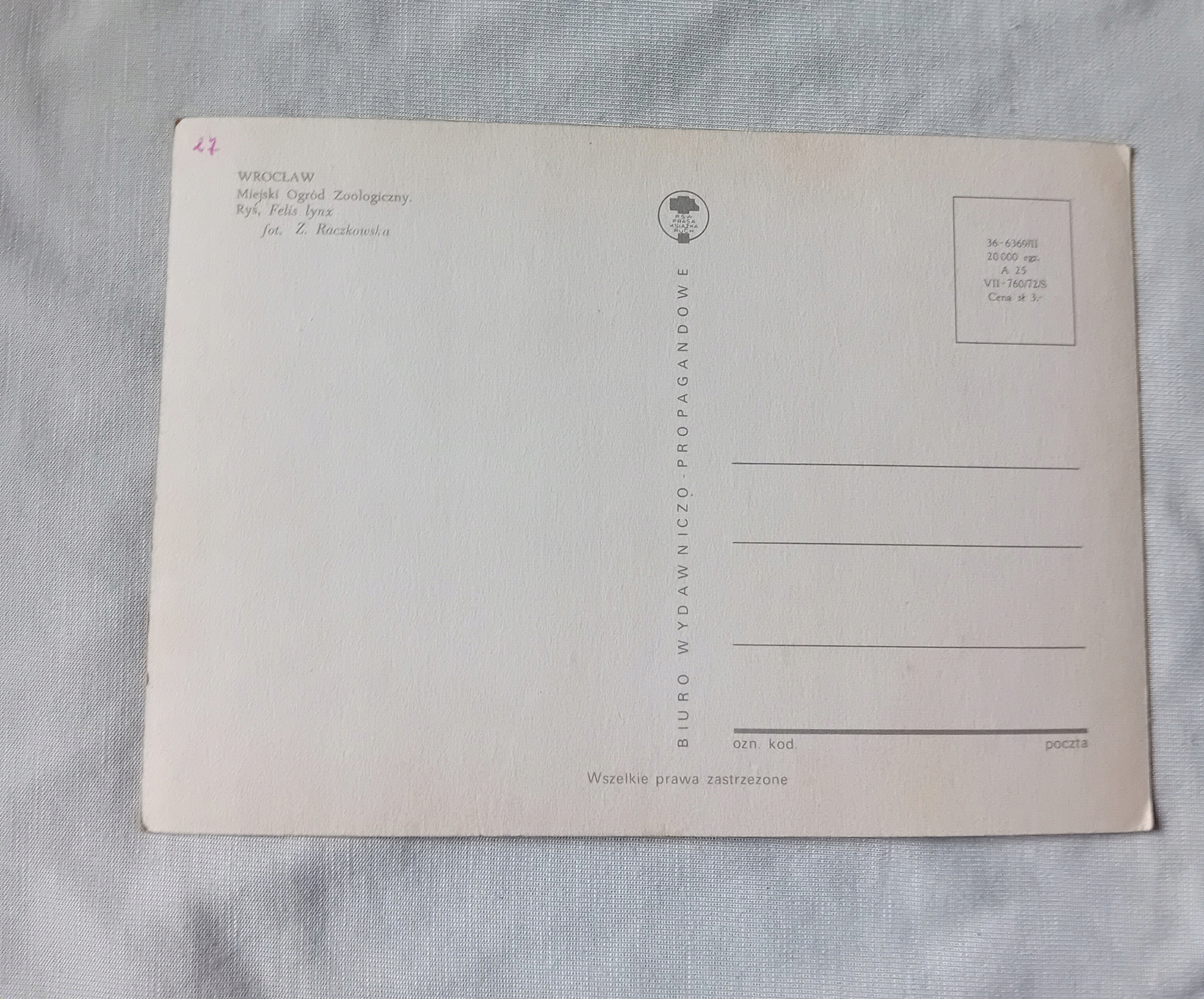 Pocztówka : ZOO Wrocław - rysie. KAW, 1972 r.