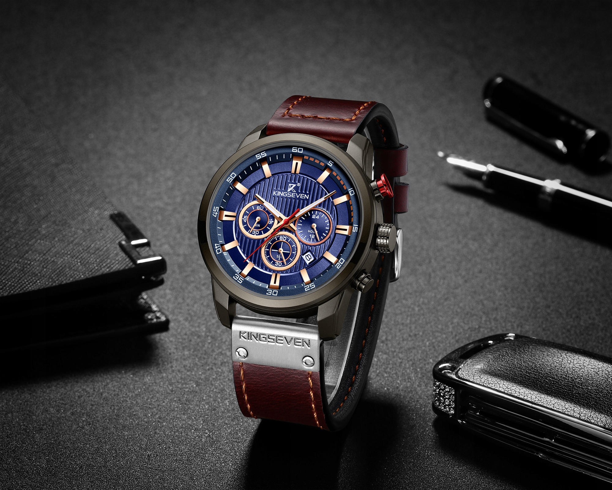 Качество и стиль в сочетании с такими высококачественными материалами, как натуральная кожа и нержавеющая сталь. создайте новые качественные мужские часы от KINGSEVEN!