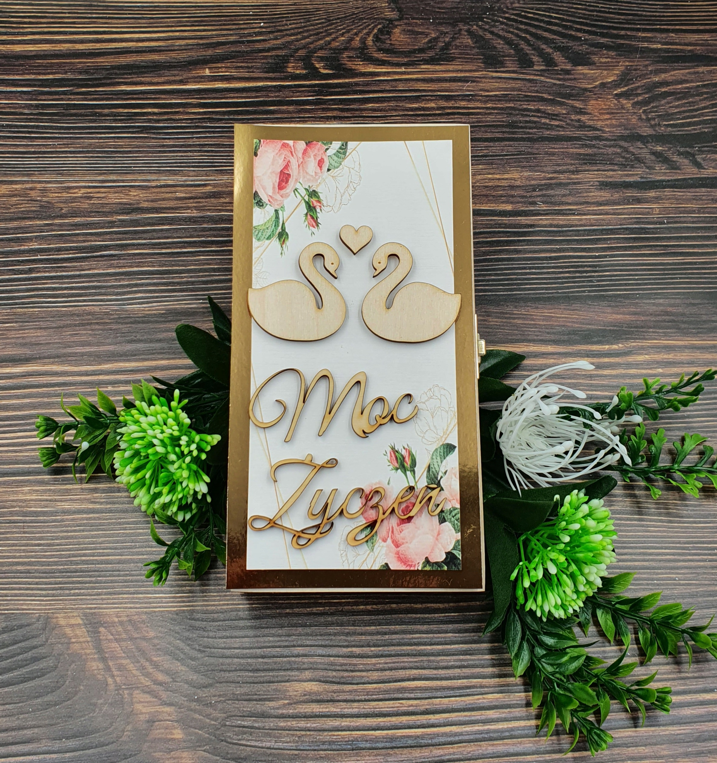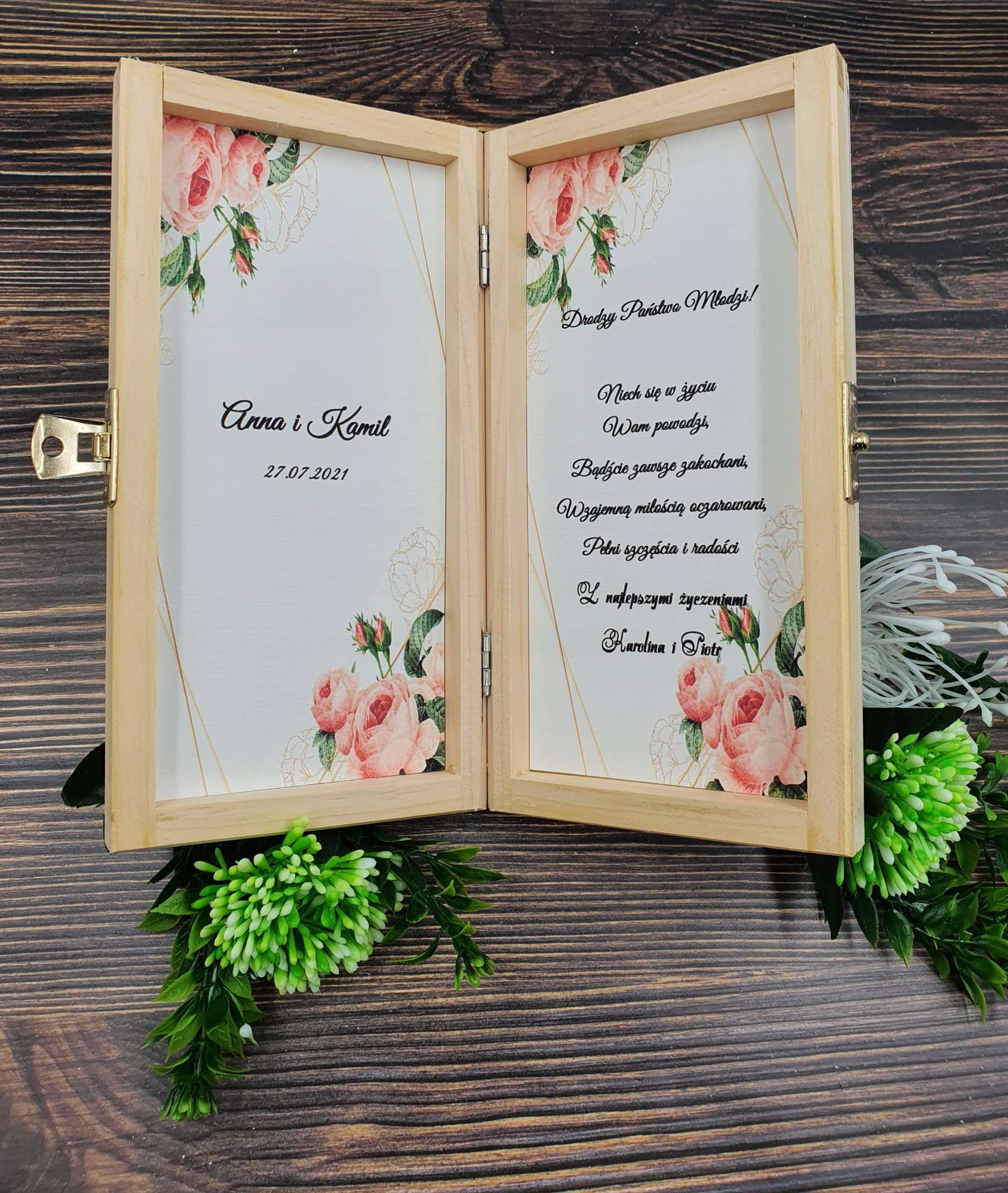 В шкатулке указаны имена жениха и невесты, а также имена людей, дарящих подарок. Вы также можете выбрать из большого количества свадебных пожеланий. Вы можете загрузить свой собственный.