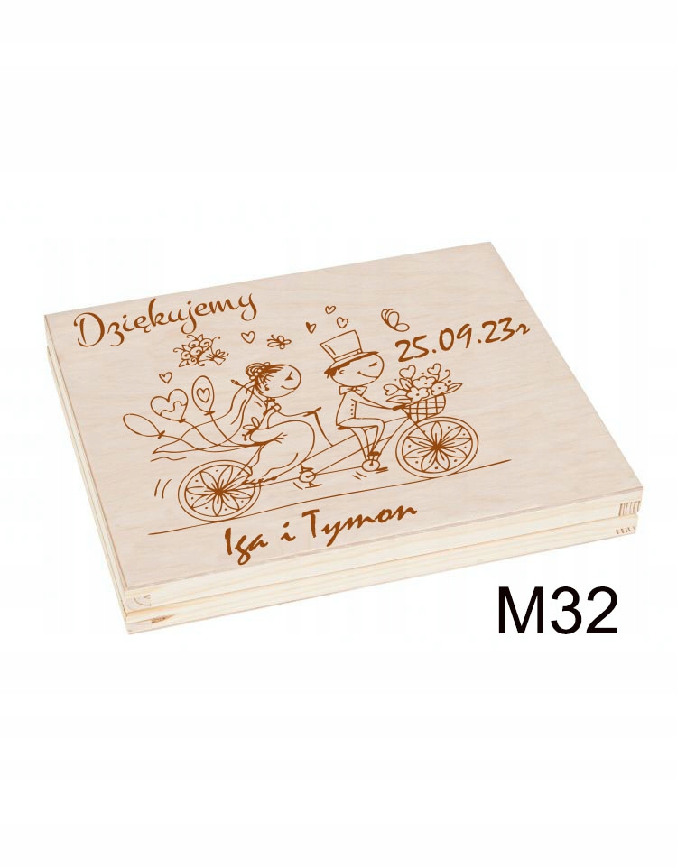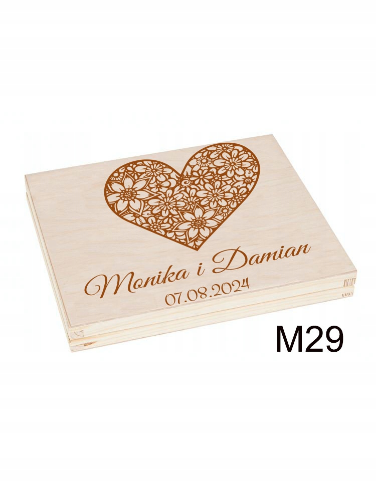 <р> Декоративная шкатулка с вашим индивидуальным текстом, благодарностью ваших родителей, крестных, свидетелей и выбранной вами гравировкой, посвященной свадебной церемонии. Коробка Merci – универсальный продукт. Их также можно использовать для любого случая. Идеально подойдет в качестве подарка близкому человеку. Идеальная коробочка – как натуральная подарочная упаковка. Внутри можно разместить шоколадные конфеты, конфеты, украшения, рамки для фотографий и т. д. предметы схожих размеров. Деревянная поверхность пригодна для декорирования в технике декупаж, что сделает ее уникальной и неповторимой. Коробка закрывается на магнит – мы уверены, что содержимое не высыпется. Внутри изящное сердечко с вашим индивидуальным текстом (можно сделать и без дарения - укажите свое сообщение в комментариях) и крышка с гравировкой по выбранному рисунку. У нас есть широкий выбор дизайнов для любого торжества — посетите другие наши аукционы. <р> ВНИМАНИЕ!!! <р> Пожалуйста, укажите выбранный образец, данные и назначение в примечаниях к заказу. <р> Цвет: Натуральный. <р> Магнит – закрытие. <р> Предложение распространяется на - 1 кусок деревянной коробки с гравировкой и посвящением.Внешние размеры продукта: