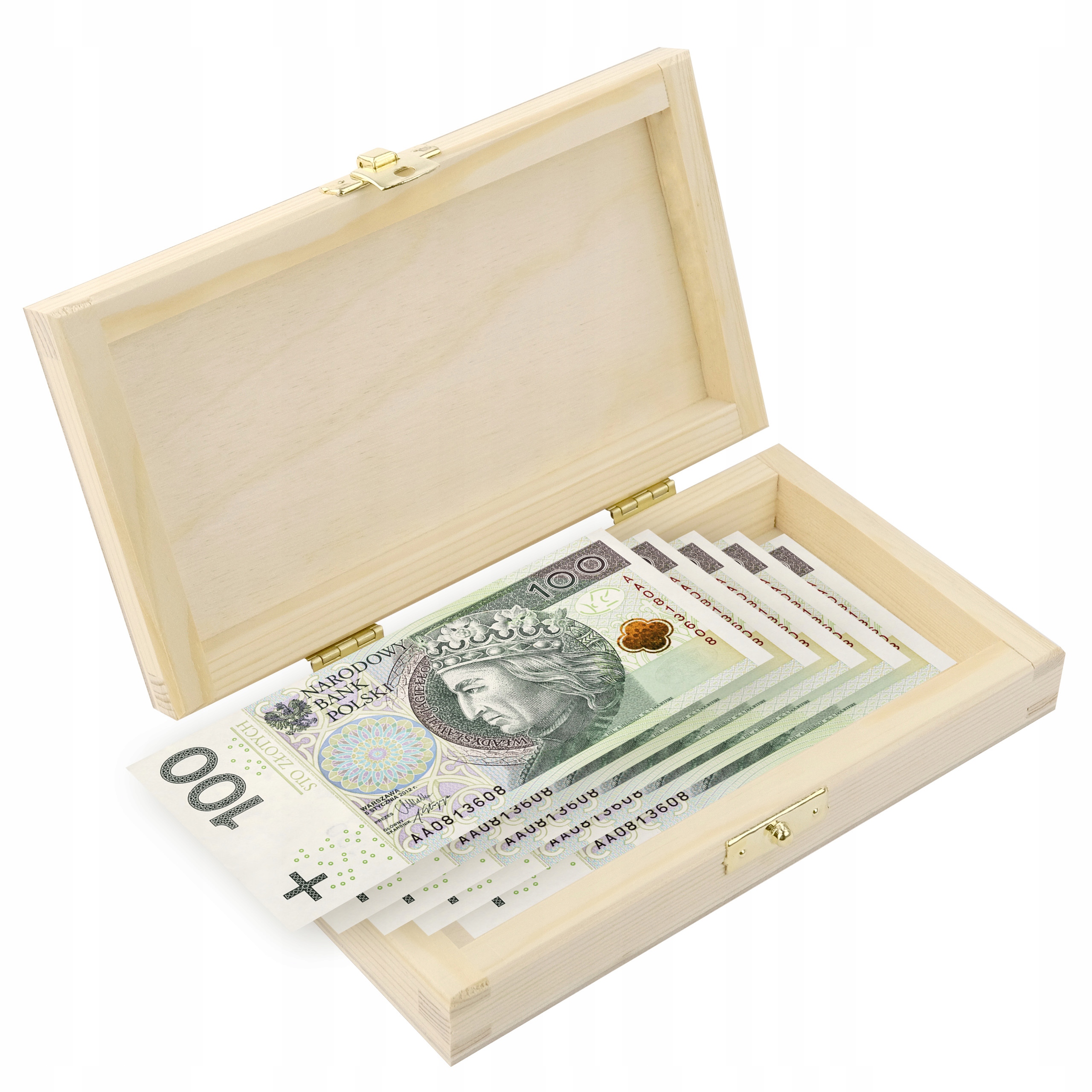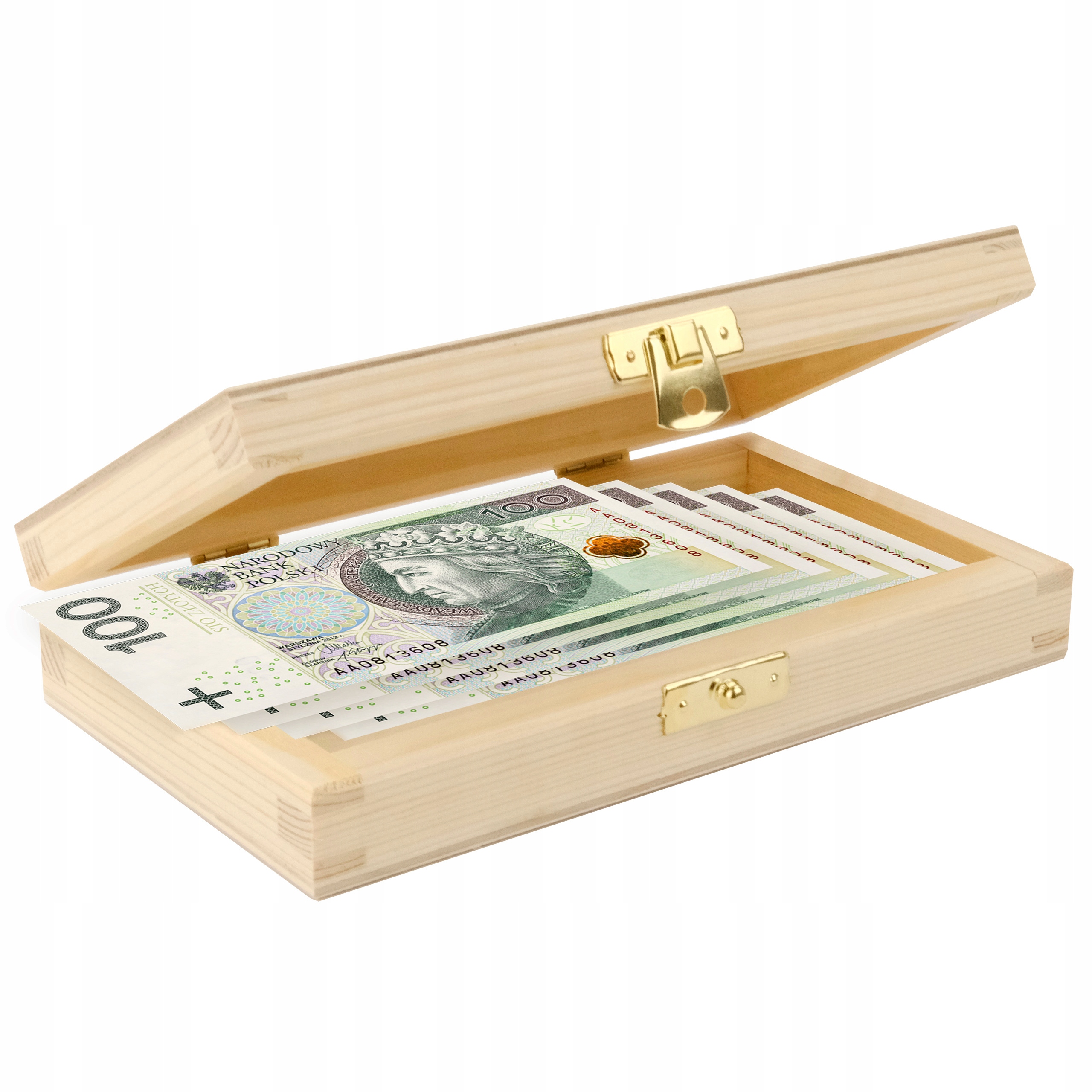 Размер коробки идеально соответствует размеру банкнот. Высота 3,5 см позволит разместить большую сумму наличных, а в длину и ширину легко поместится банкнота номиналом 500 злотых.