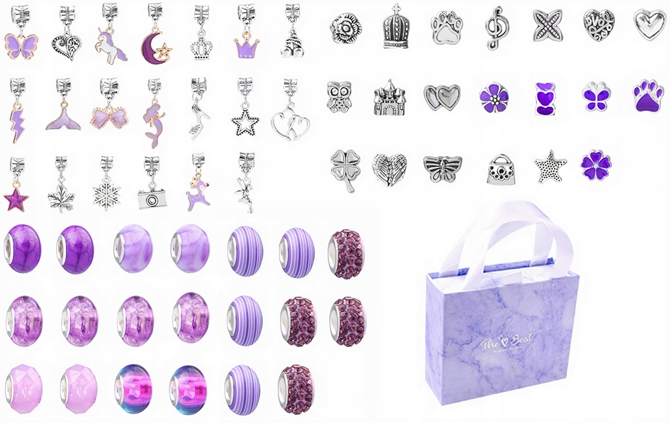 В целом набор содержит целых 64 элемента. Это позволит создать различные конфигурации из 60 подвесок. Дополнительно в комплекте идут 3 браслета, все упакованы в элегантную коробочку.