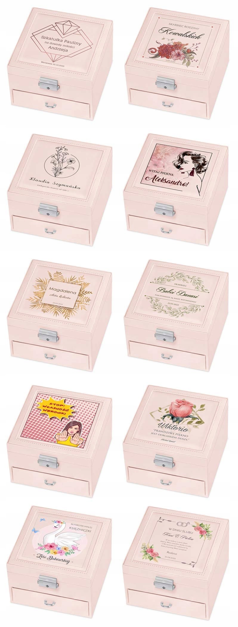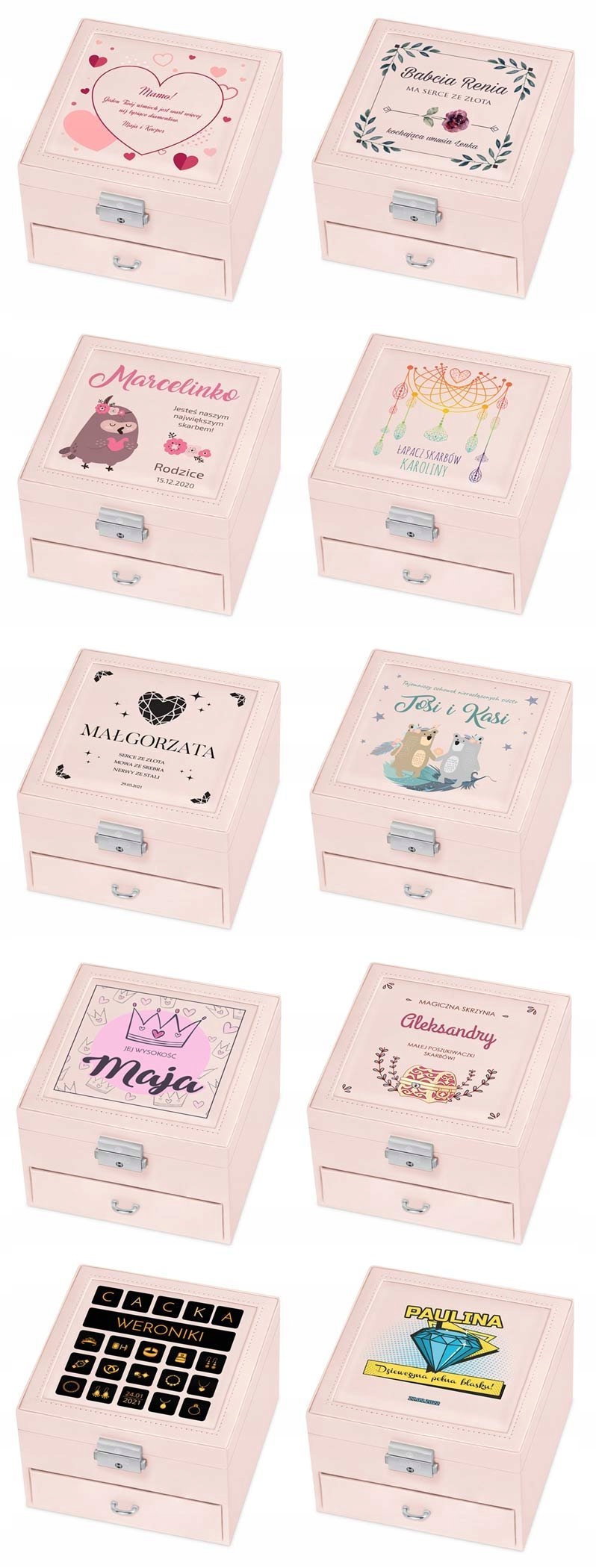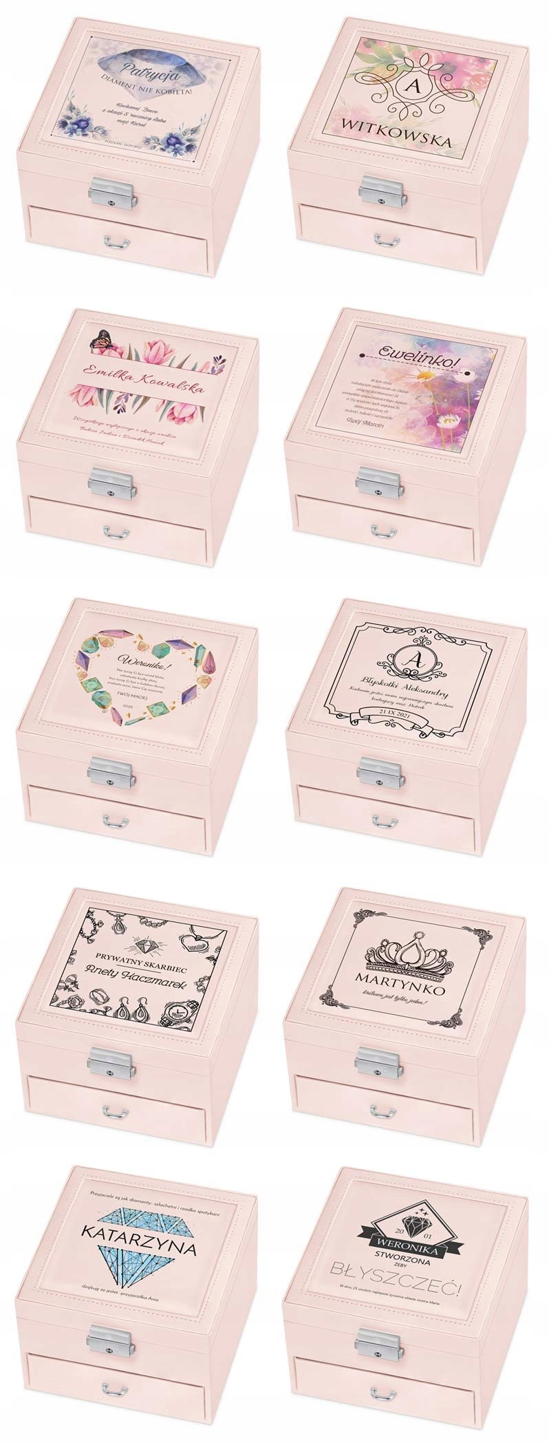 Вам интересно, что лучше всего подойдет в качестве оригинального подарка для особенной женщины? Наша шкатулка для драгоценностей идеально подойдет на эту роль. Он характеризуется классической формой и точными деталями. Приятные, пастельные цвета корпуса и тонкая строчка подчеркивают эксклюзивность изделия. В верхней части находится большое подвижное зеркало и место для ожерелий, браслетов и десяти колец. В нижней части коробки имеется ящик с девятью отдельными местами, например, для сережек, подвесок и других аксессуаров. Пространство внутри чехла покрыто приятным на ощупь бархатным материалом.