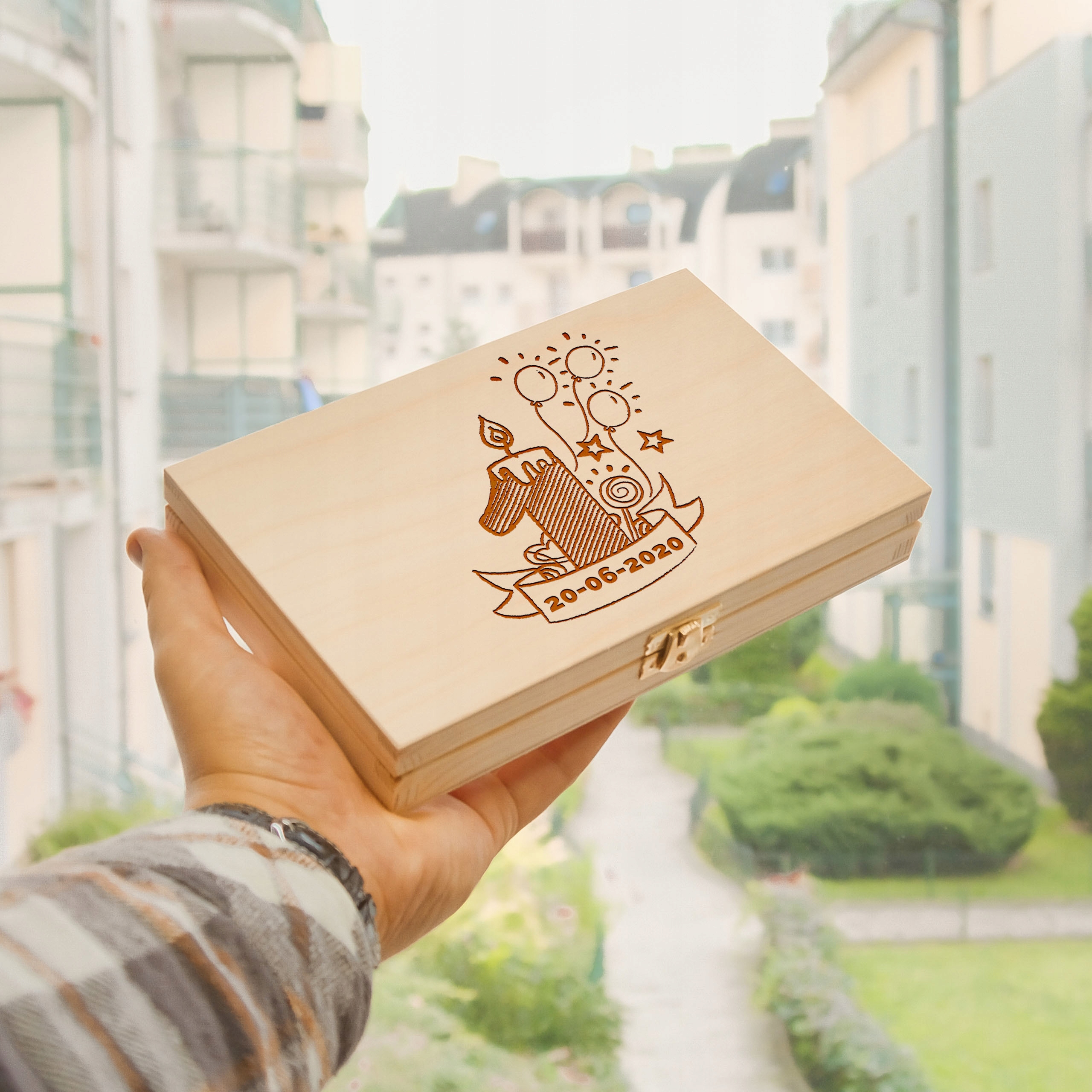 Коробка с персонализированной гравировкой на крышке — идеальная упаковка для небольшого подарка, например шоколада.