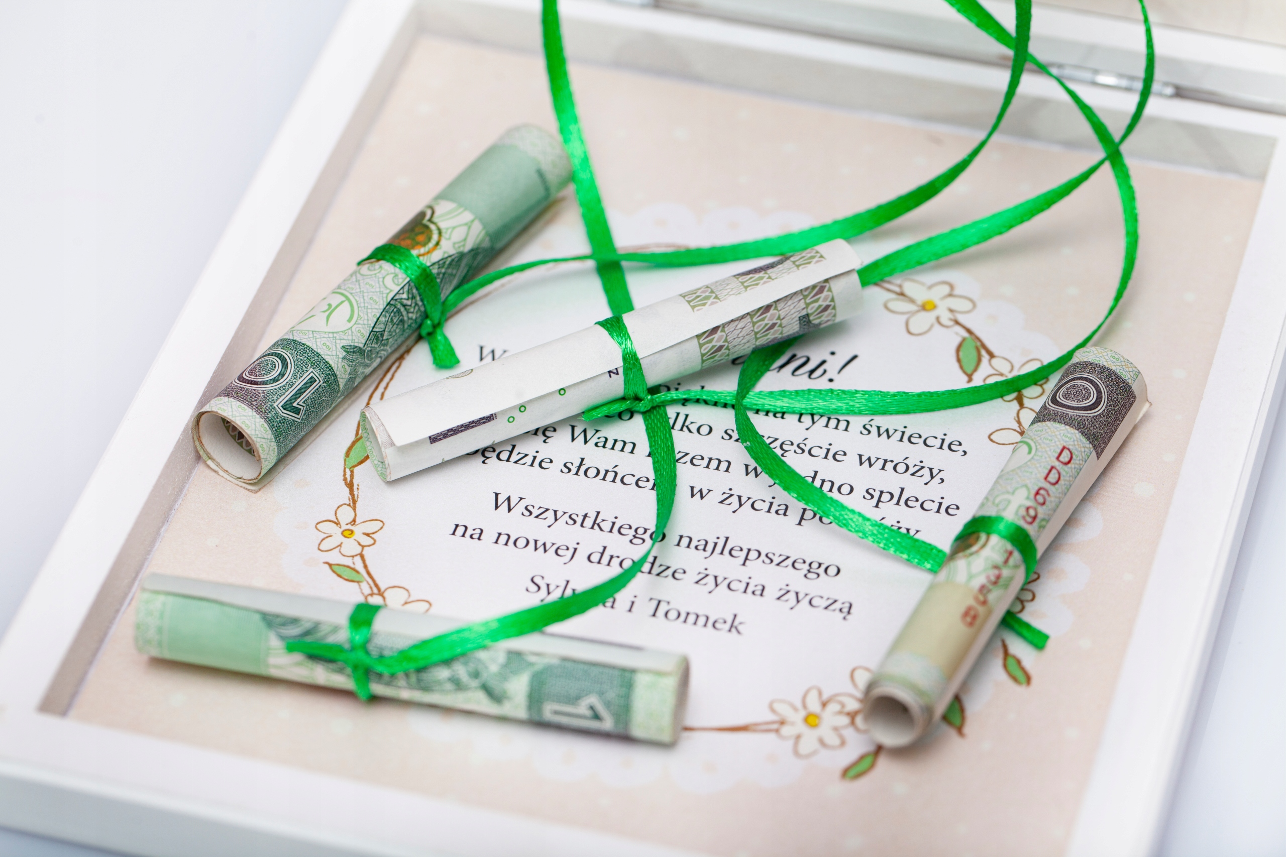- Ленты длиннее, чтобы можно было легко прикрепить купюры – здесь мы оставляем простор для творчества тому, кто их дарит. Дополнительно на концах можно завязать бантики или конфеты. Лишнюю ленту следует отрезать.