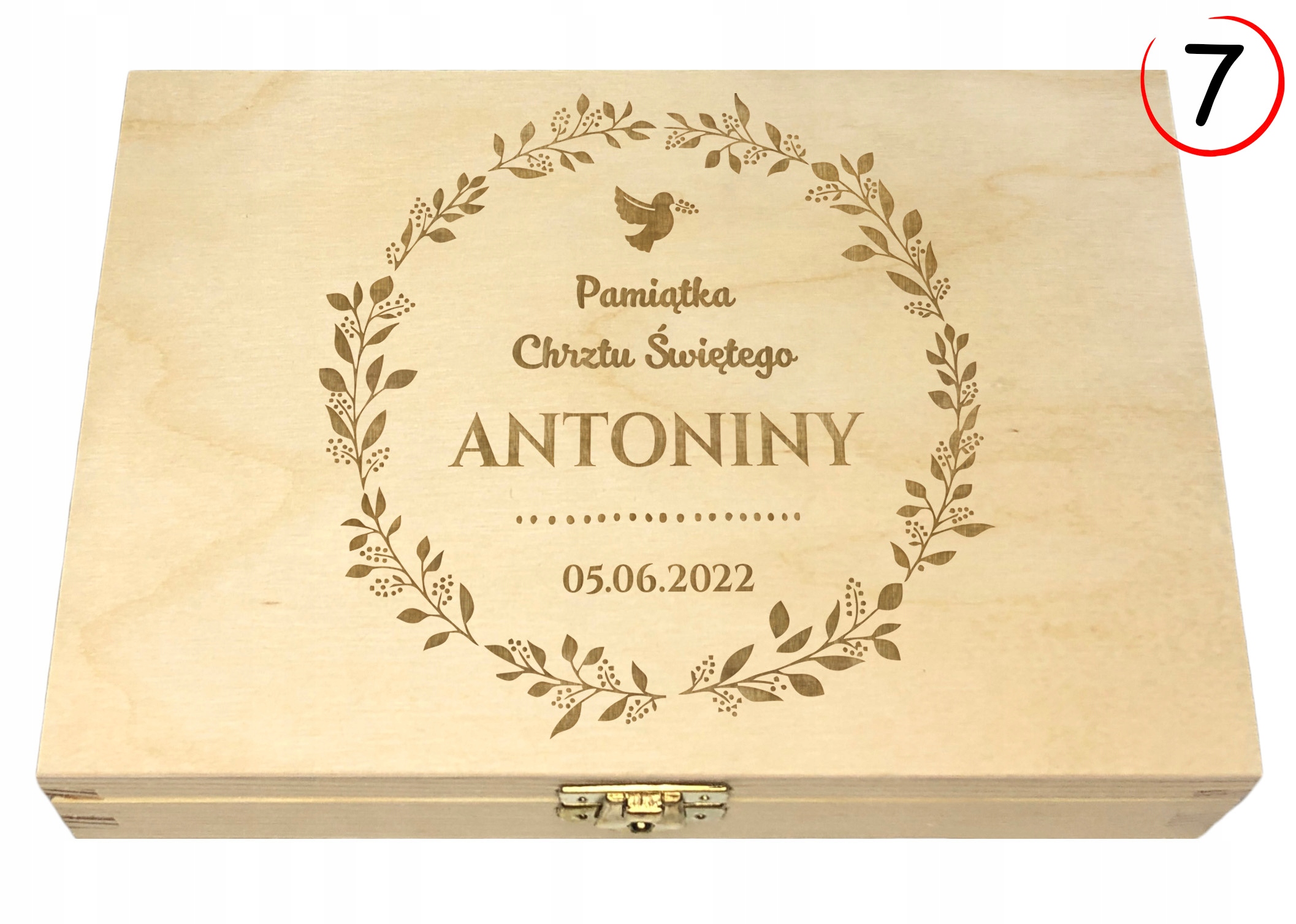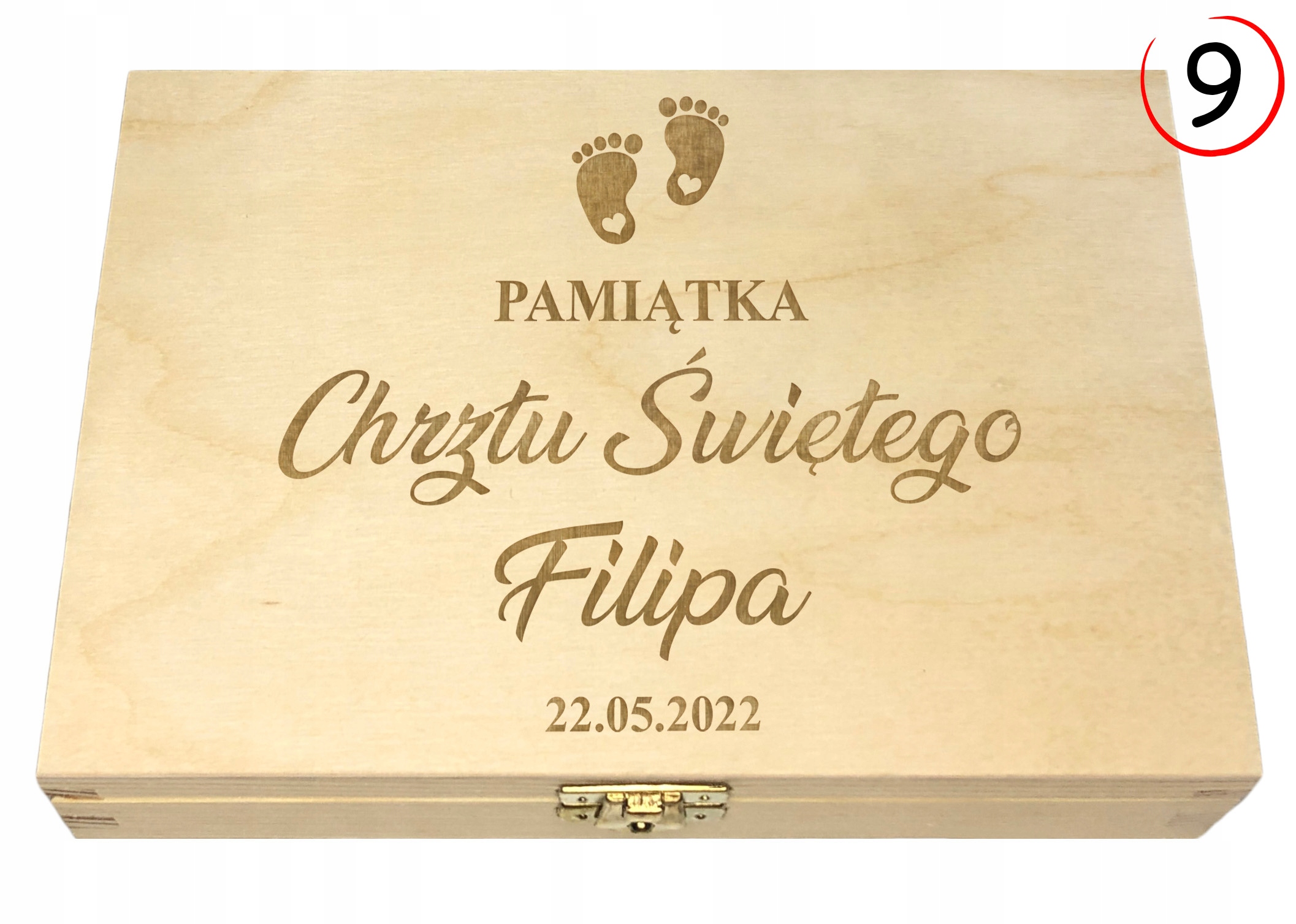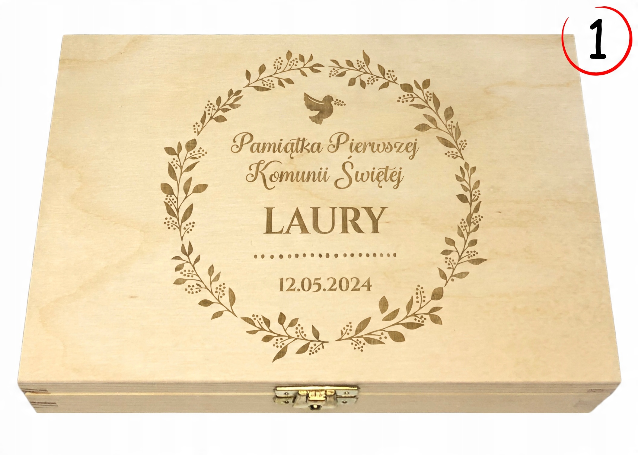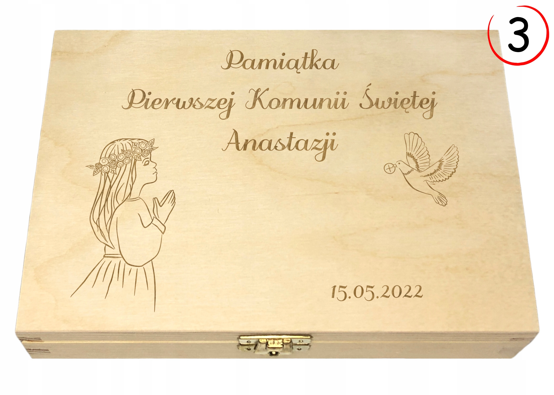 Деревянная шкатулка с гравировкой идеальна как дополнение к подарку на Первое Причастие или Крещение. В набор входит сено, на котором можно разложить подарки для ребенка.