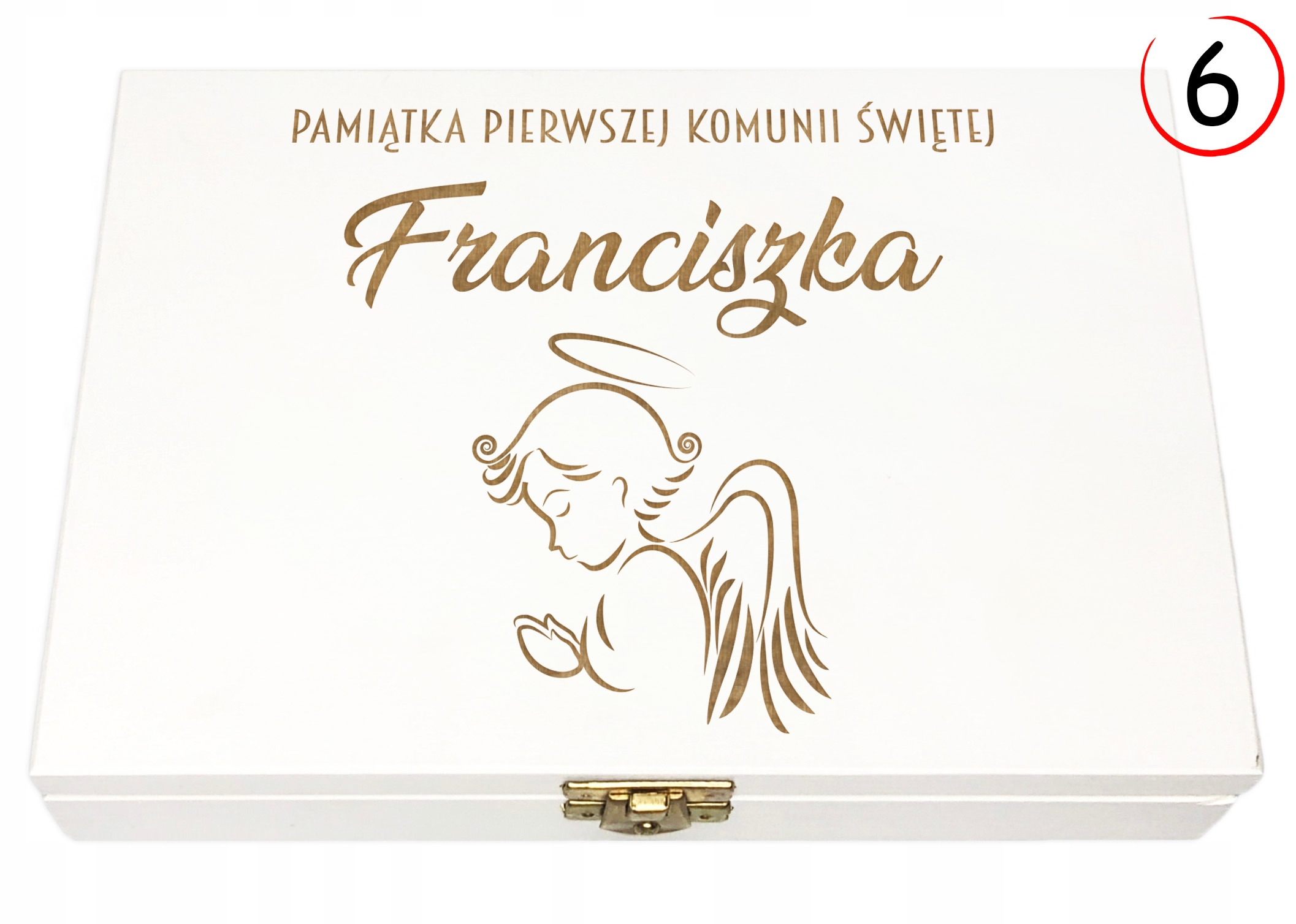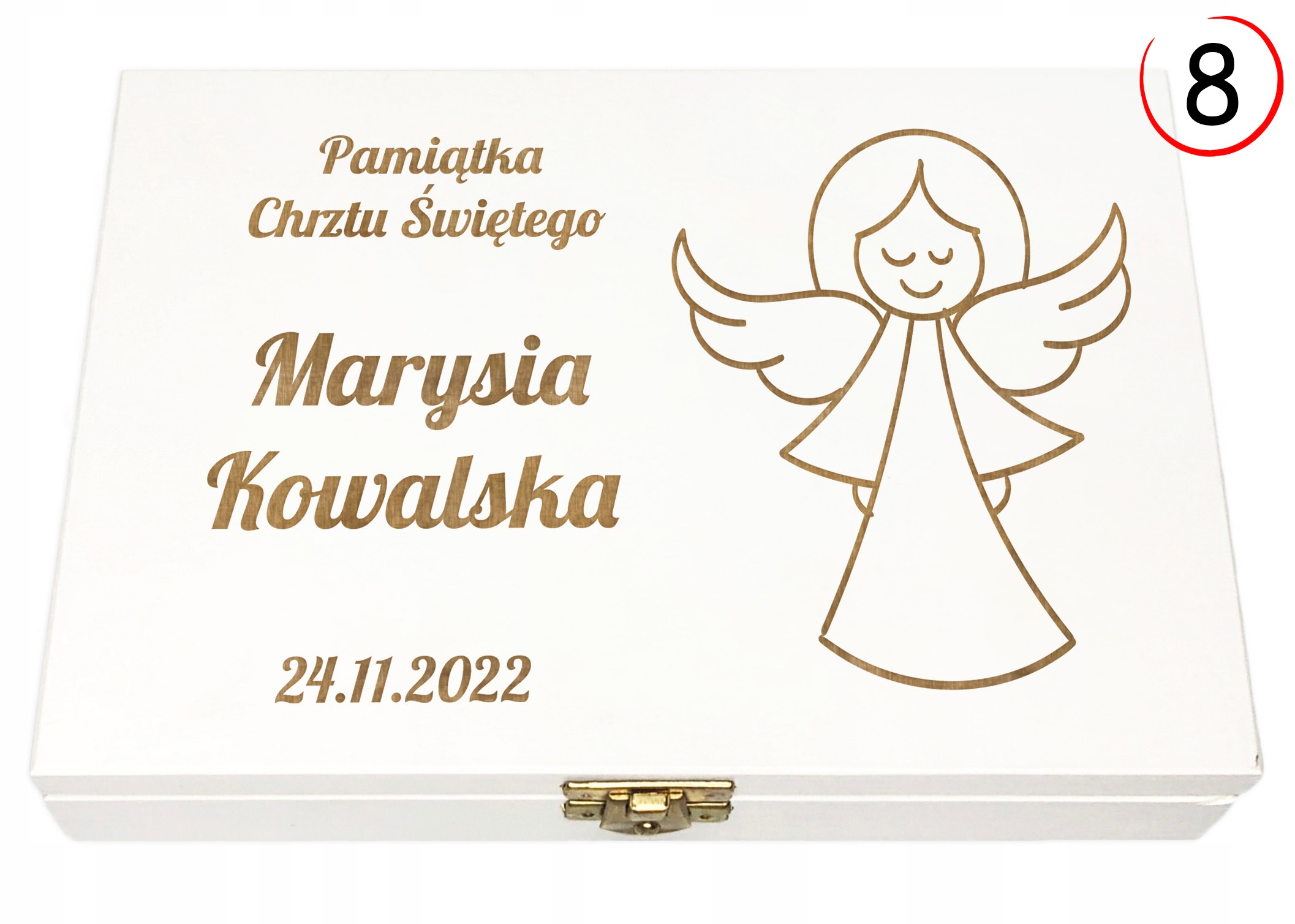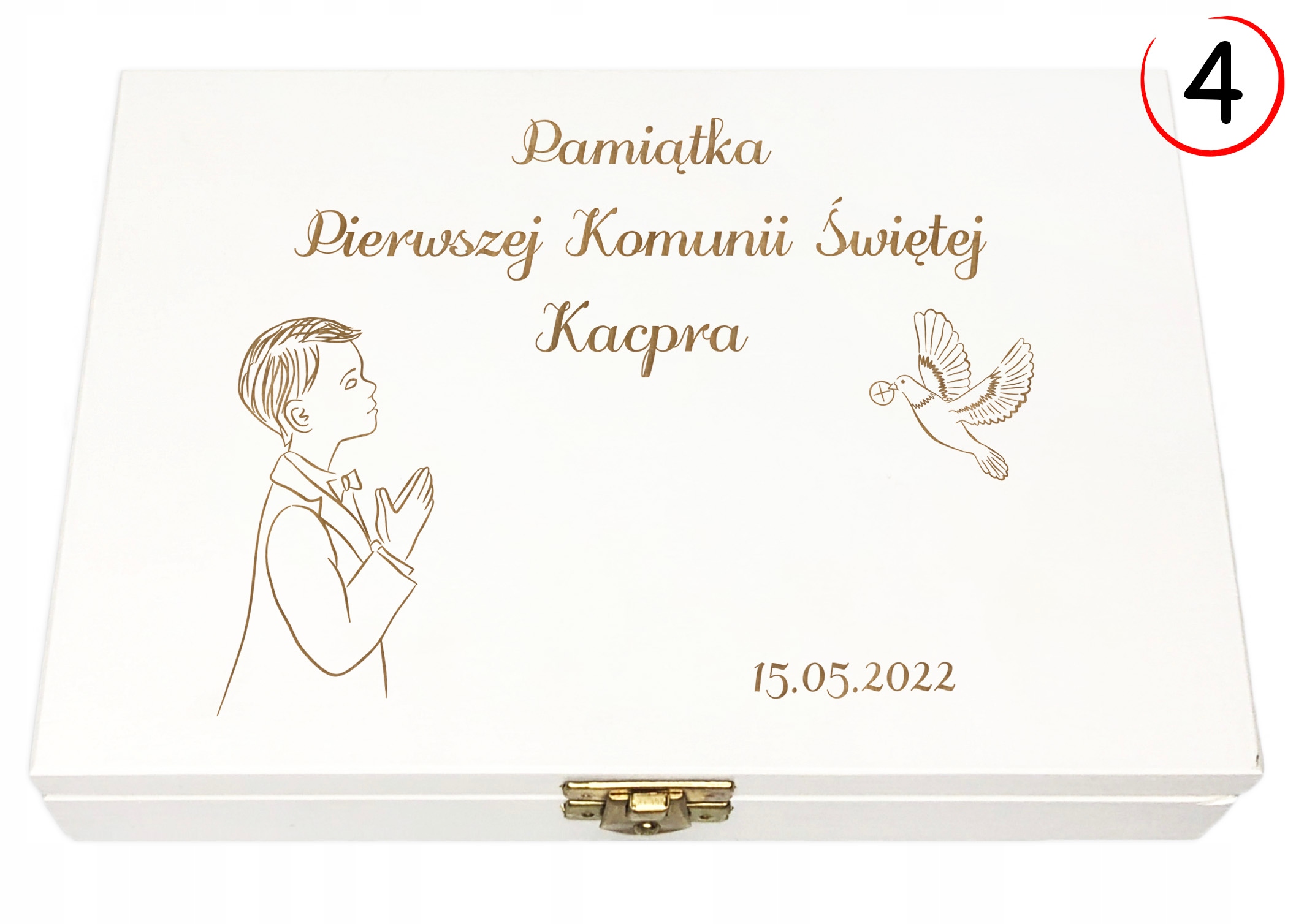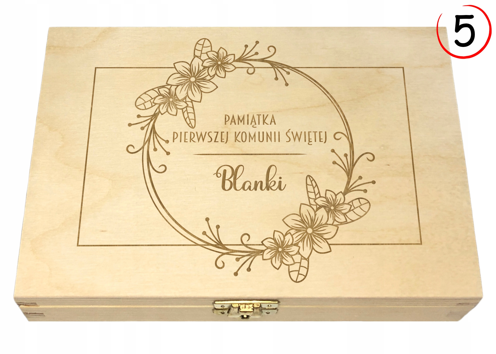 Деревянная шкатулка с гравировкой идеальна как дополнение к подарку на Первое Причастие или Крещение. В набор входит сено, на котором можно разложить подарки для ребенка.