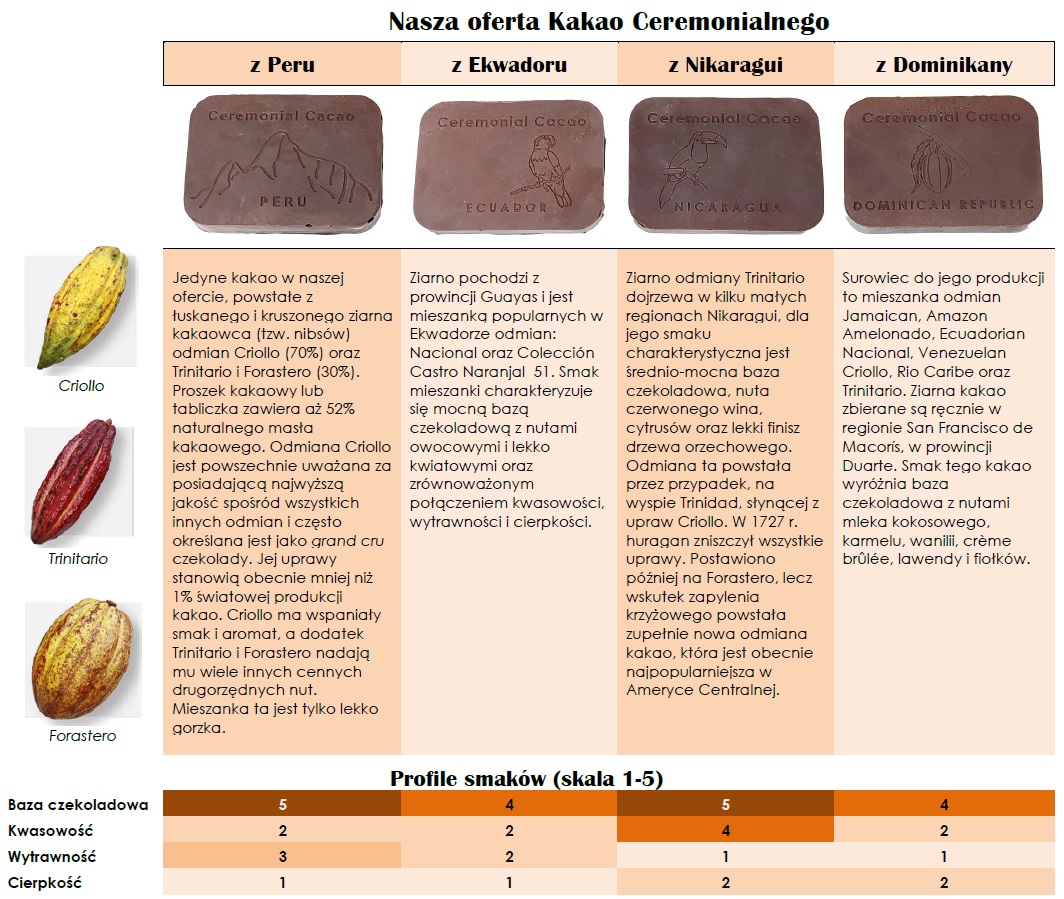 Церемониальное какао производится на нашем биосертифицированном заводе недалеко от Варшавы. Мы также предлагаем их в виде таблеток (100-150-160 г) и порошка (170, 285, 400 г).