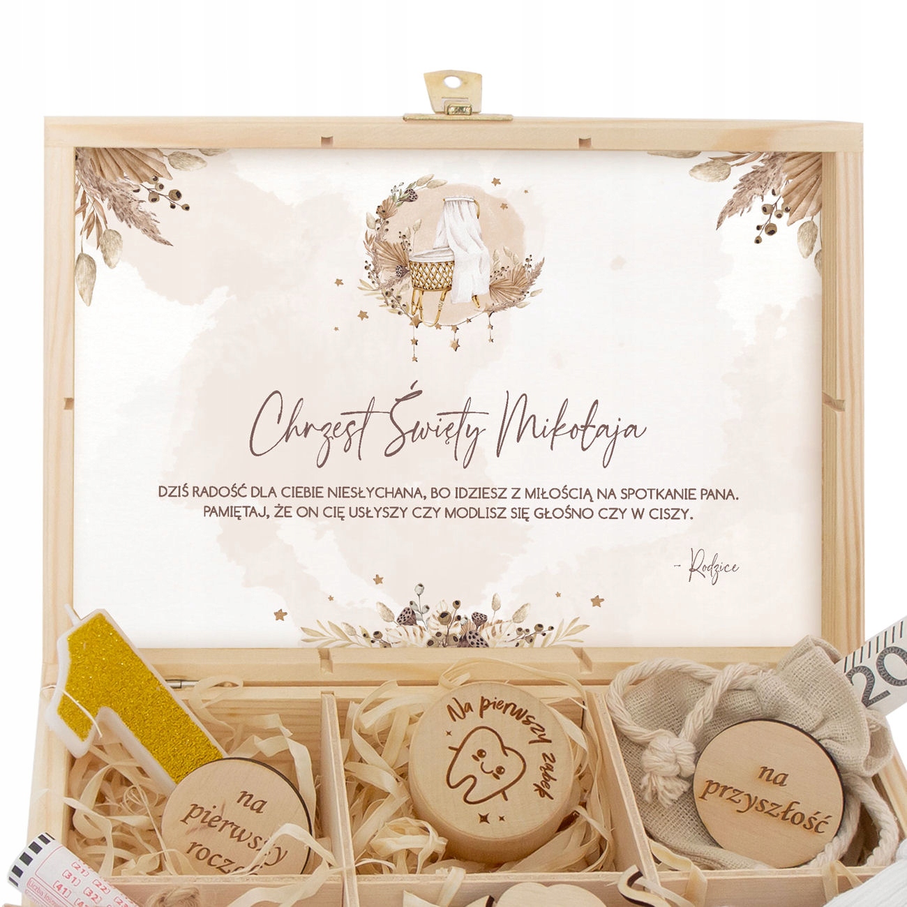 Мы представляем вам уникальный сувенир по случаю таинства святого крещения. это обязательно -какое -то, в котором есть: свеча в течение первого года, зубная ящик, сумка для денег, купон на лотерею, слон и носки.