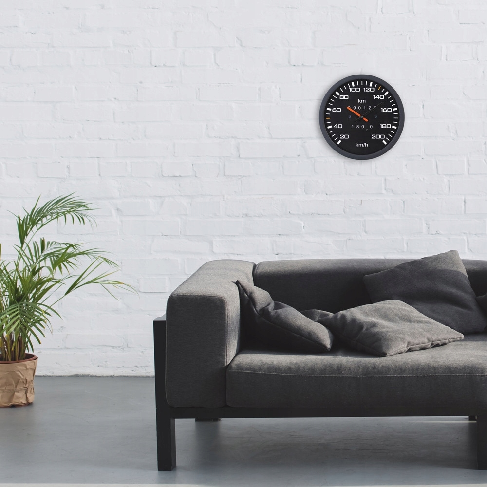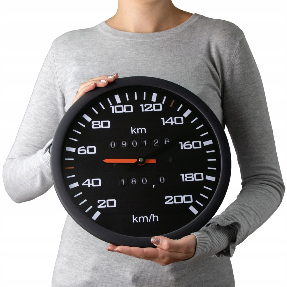 Часы «Спидометр» — это круглые настенные часы, циферблат которых отсылает к внешнему виду автомобильных одометров рубежа 80-х и 90-х годов. Часы на циферблате заменены шкалой спидометра, шкала которой достигает 200 км/ч. На циферблате также имеется напечатанный одометр, который всегда будет иметь небольшой пробег. ;)