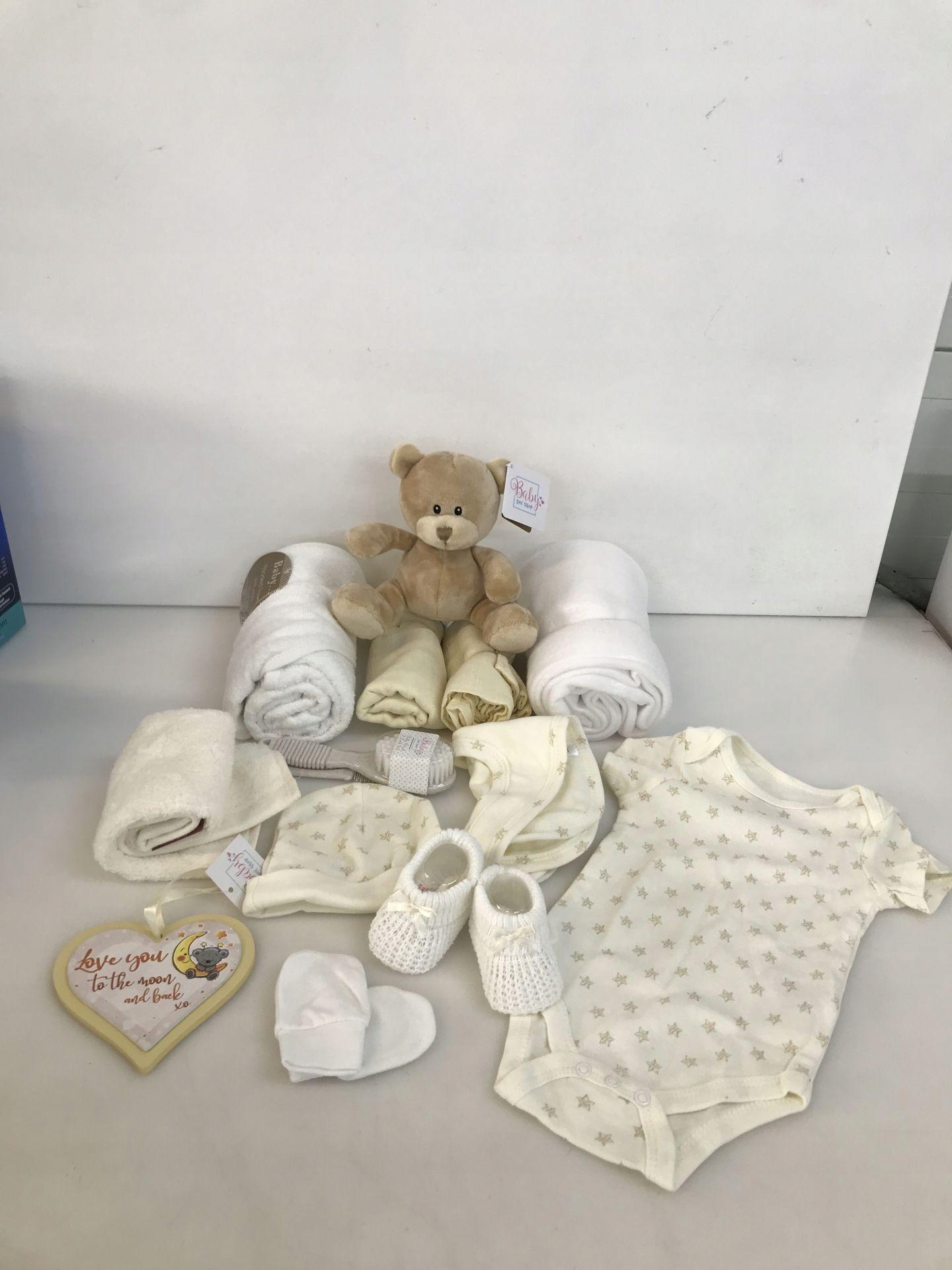 ПОДАРОК. Представьте себе, что вы преподносите эту красиво оформленную подарочную корзину кремового цвета для детского душа, красиво упакованную в шифоновую сумку из органзы на шнурке. Родители будут очень рады, когда распакуют тщательно приготовленные, вручную отобранные подарки для своего ребенка.