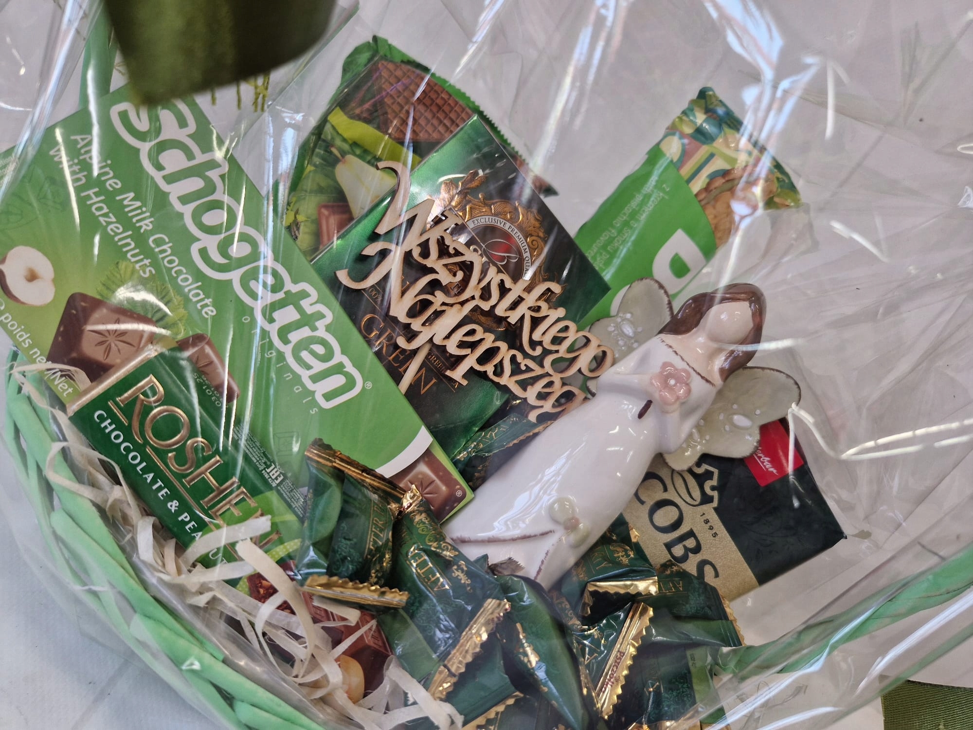 Корзина, наполненная сладостями, осторожно упакованная в целлофан и украшенная луками. Идеально подходит для каждого случая - день рождения, день имени, праздники или в качестве подарка компании.