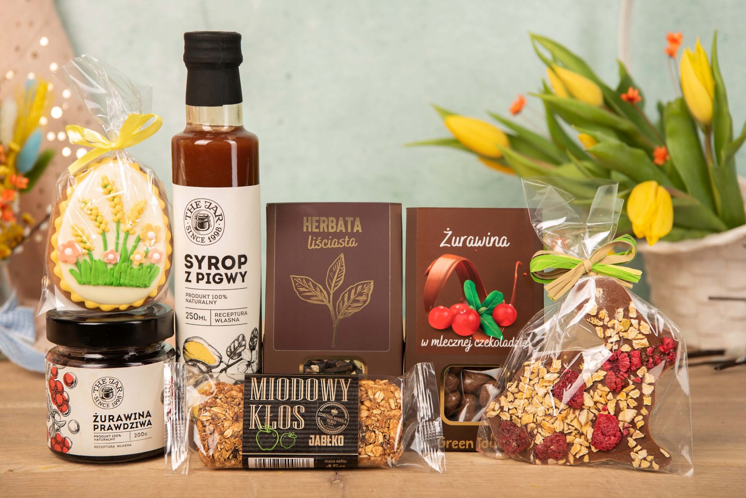 Набор сладостей Green Touch – идеальное предложение для любителей натуральных вкусов. Они включают, среди прочего: чай с фруктами, клюква в молочном шоколаде, шоколад в форме пасхального кролика, пряники, айвовый сироп, клюквенное варенье и медовая уха с яблоком. Все упаковано в элегантную подарочную коробку.