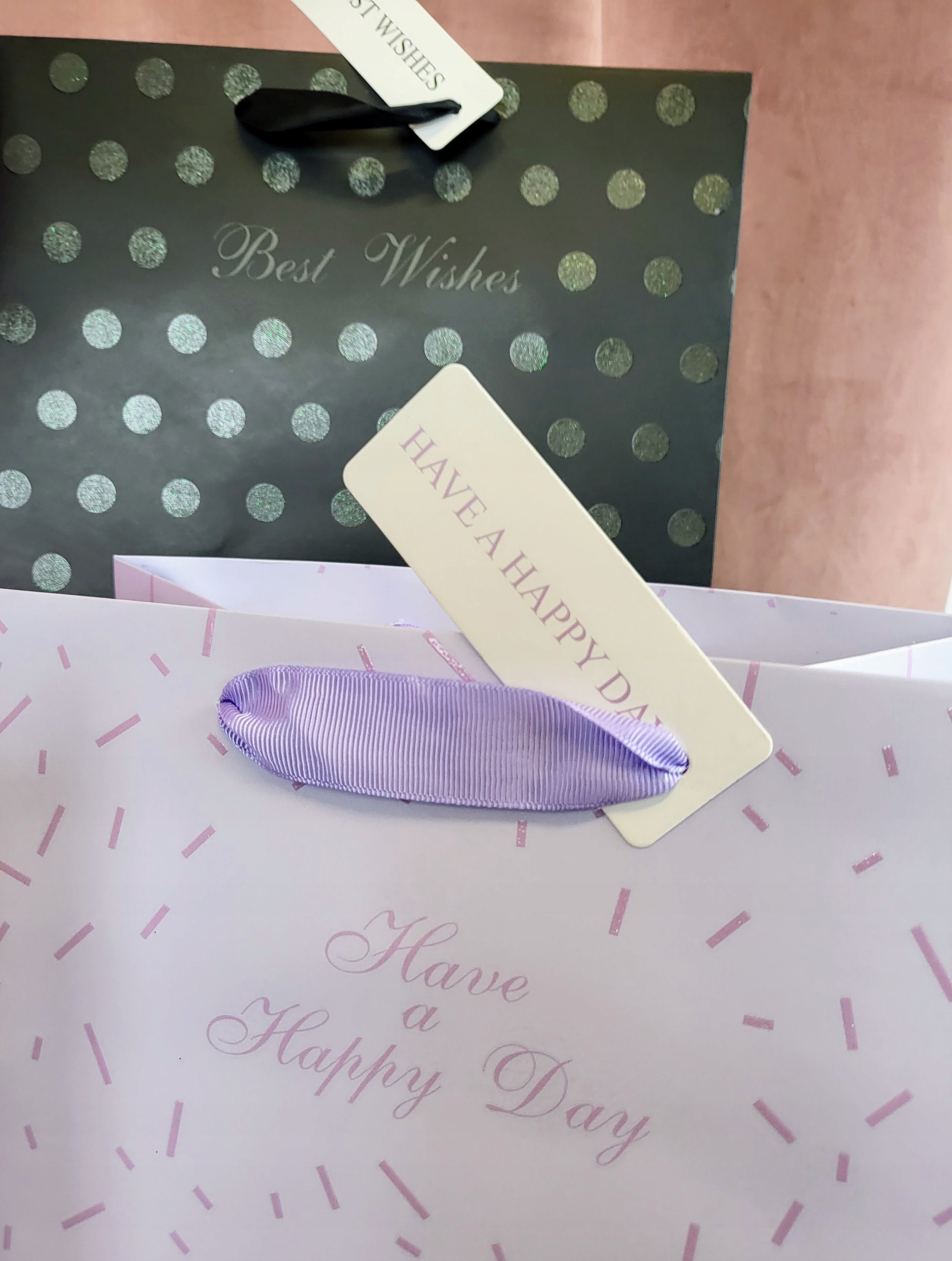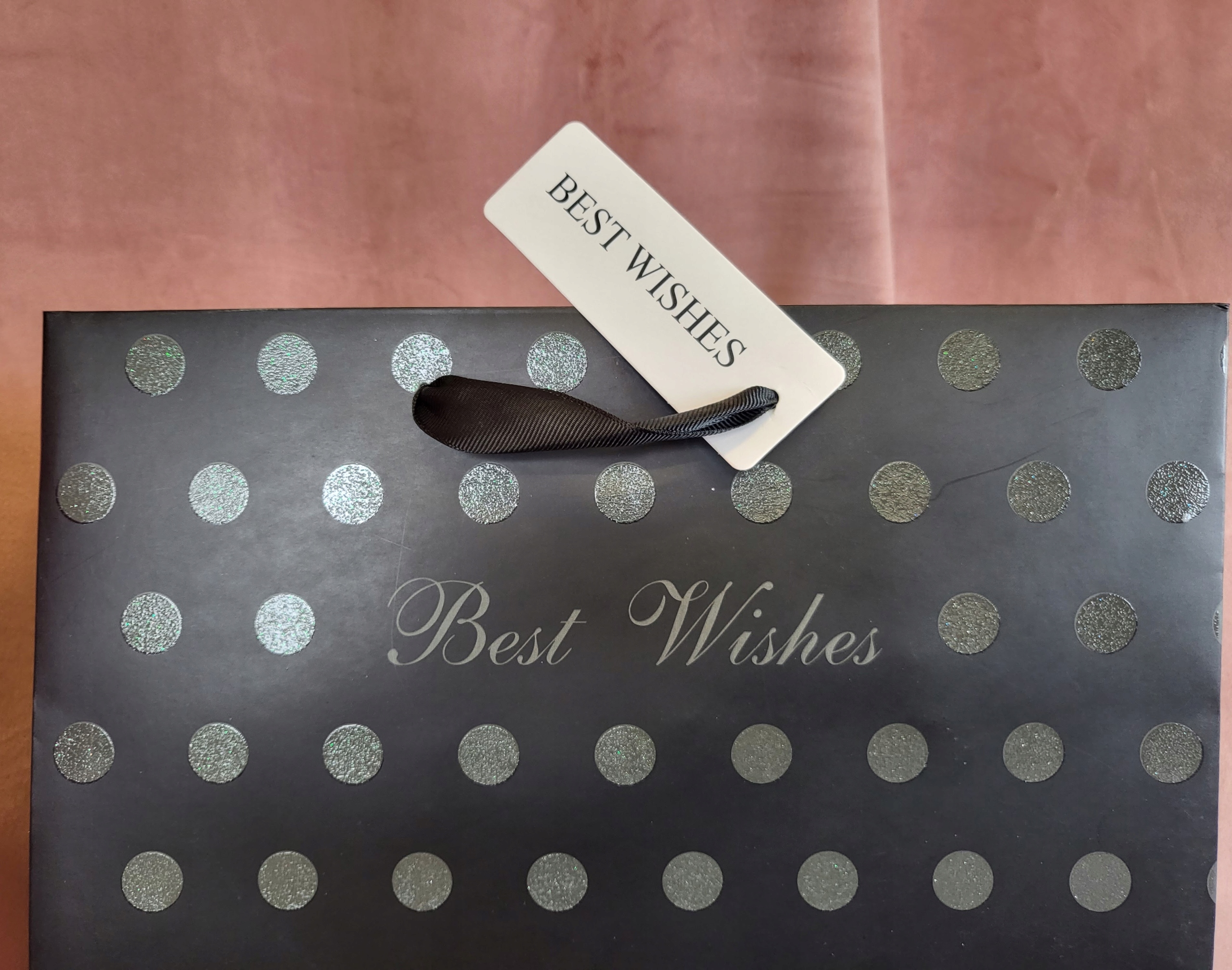 Элегантный подарочный пакет, украшенный надписями. Изготовлен из качественной, плотной бумаги. Ручки изготовлены из веревки соответствующего цвета.