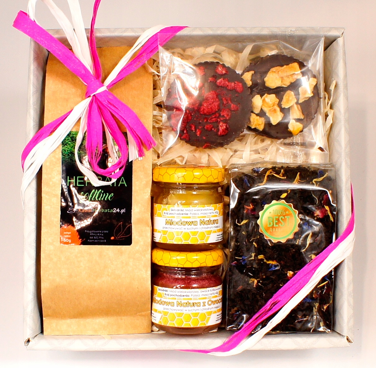 Набор упакован на экологическом сосновом «сене», в целлофановой фольге и перевязан разноцветной лентой или набором лент из рафии.