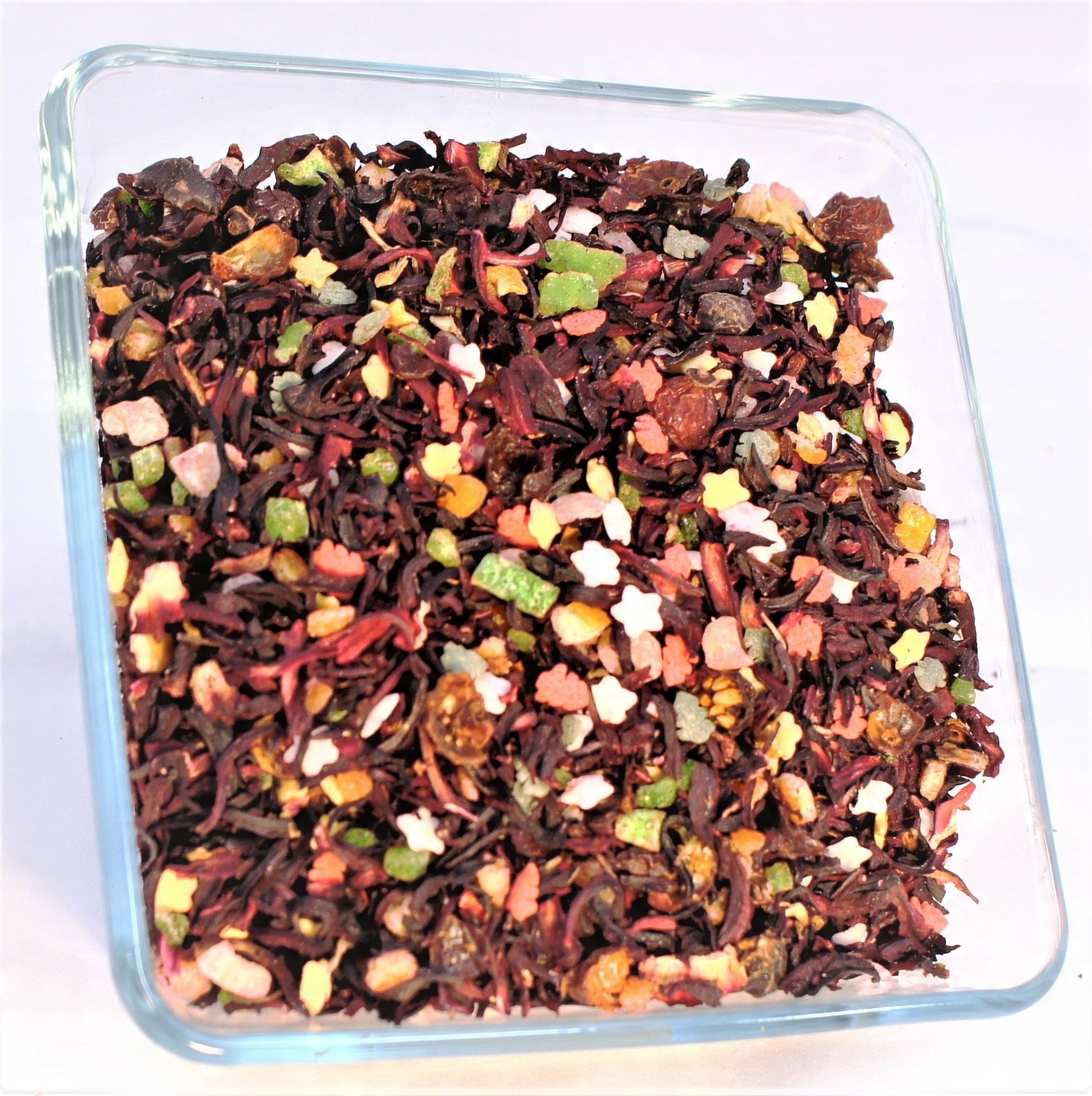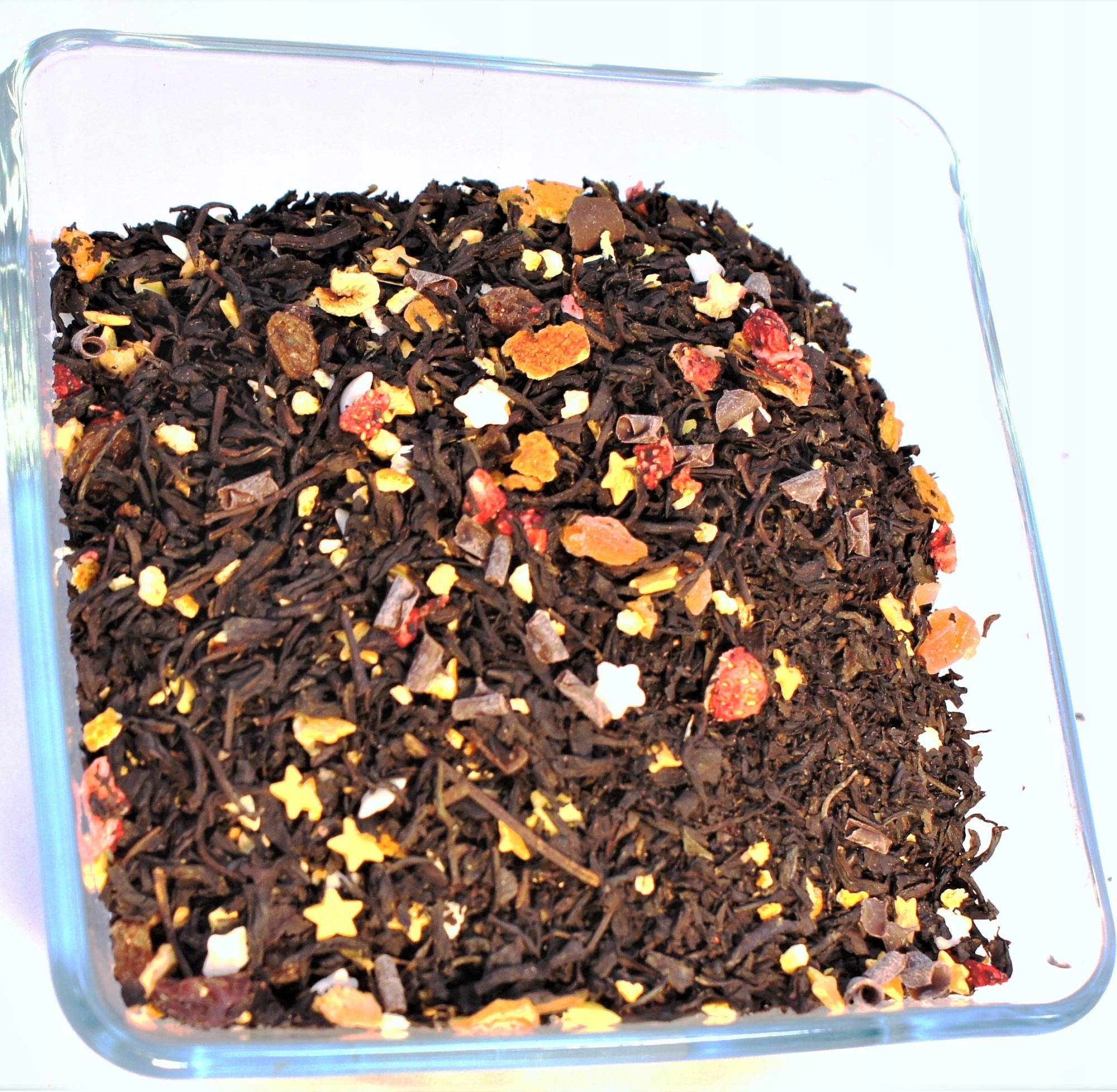 Сверху слева: Рождественское волшебство с фруктами, сахарными звездами и зелеными елками, Письмо Санте на основе черного чая Yunnan OP с фруктами, шоколадной стружкой (темный шоколад Callebaut) и сахарными звездами и туфлями Санты, Зимний апельсин на основе czarkj Argentina OP с ароматом апельсина и других фруктов с рождественским ароматом.