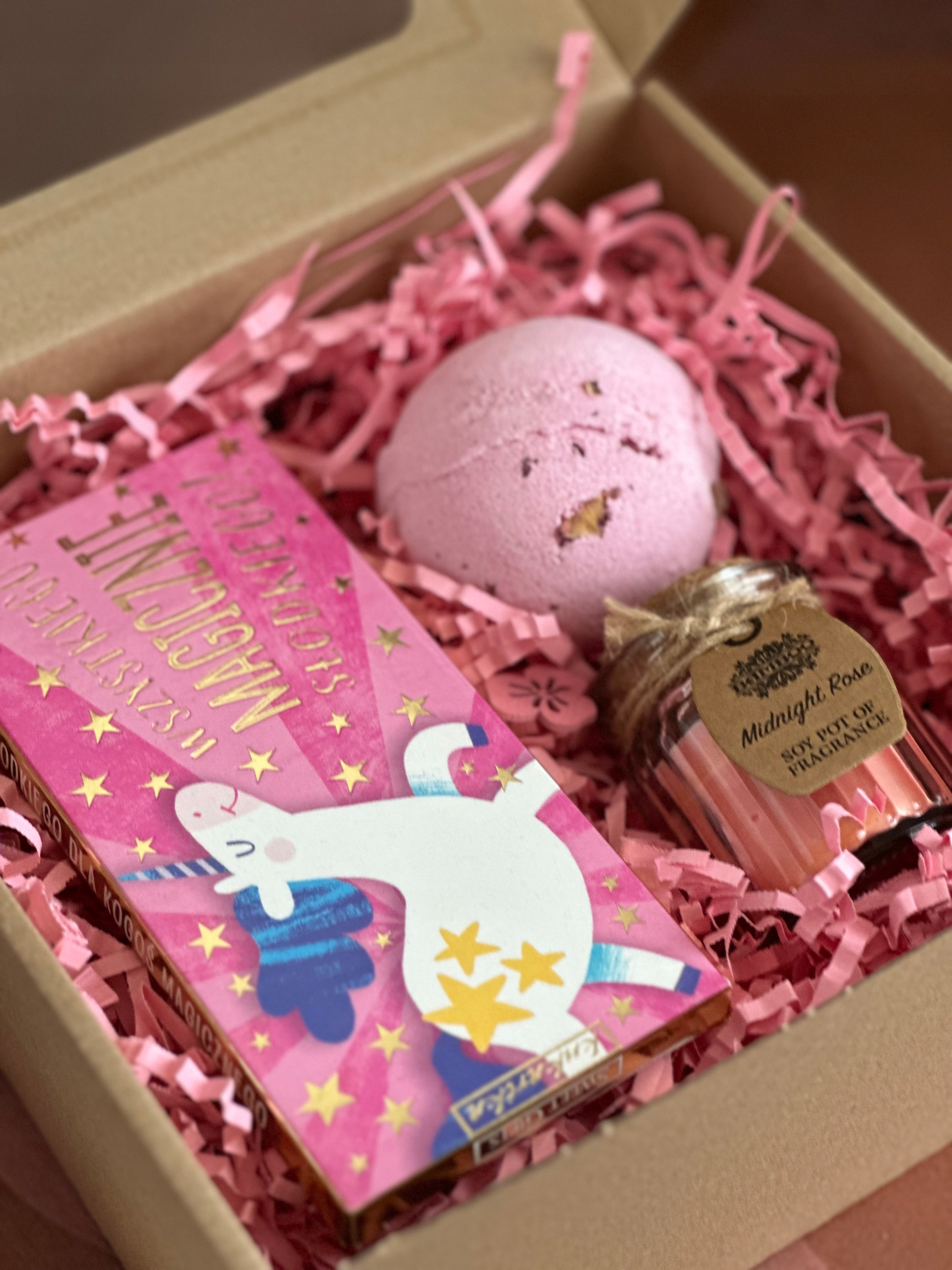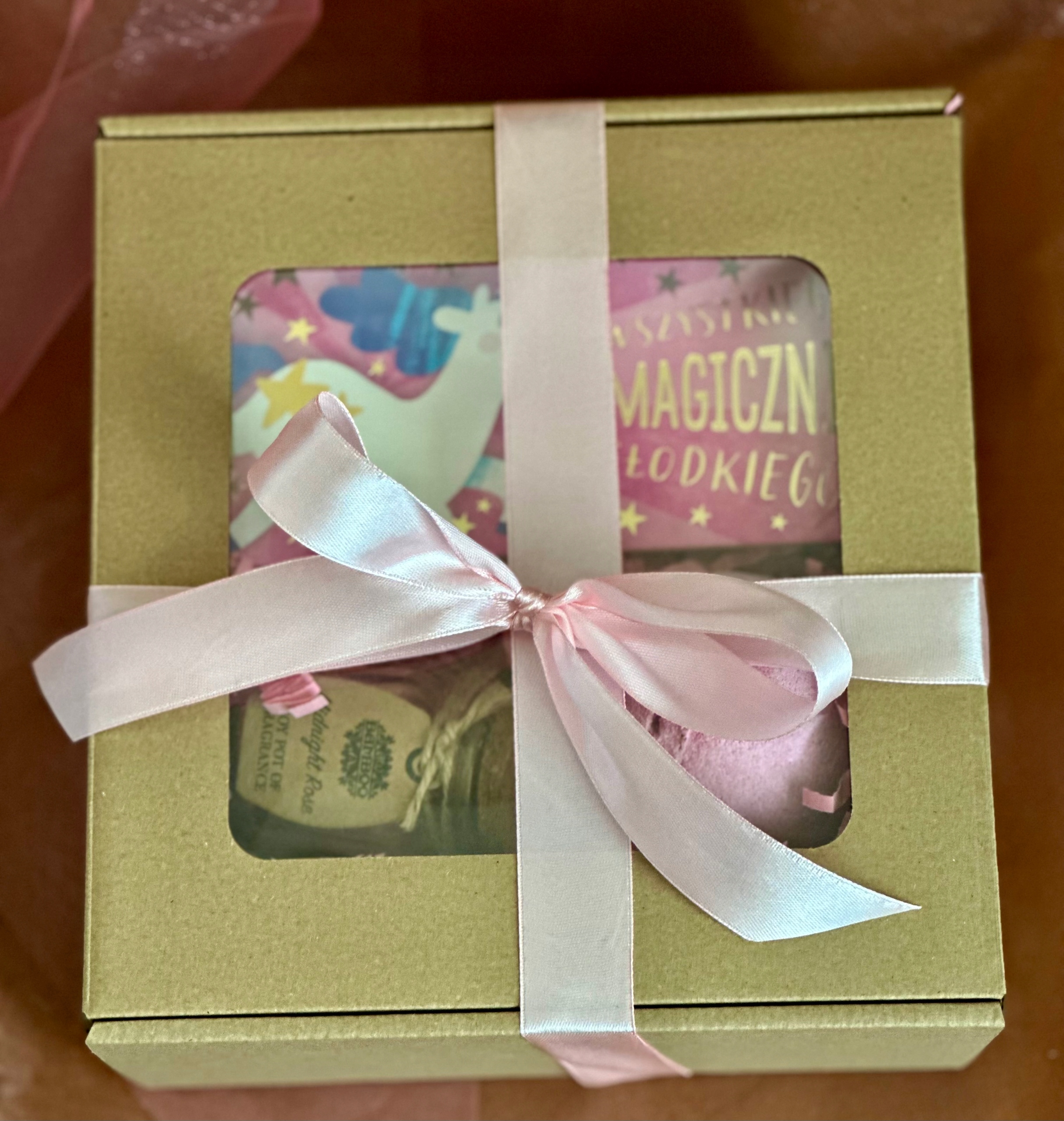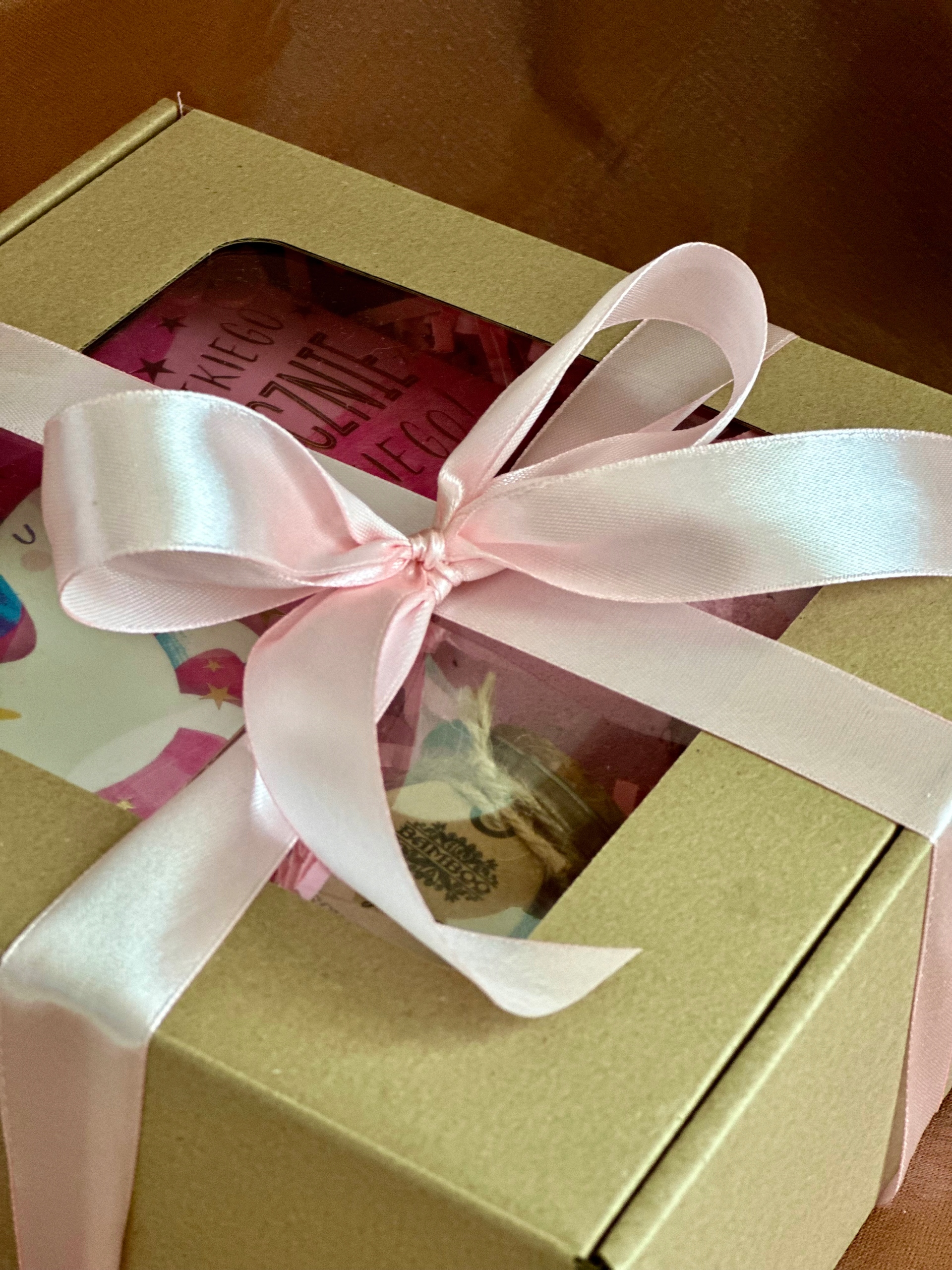 Уникальный подарочный набор в элегантной коробочке с красивым розовым наполнением, декоративными цветами и розовым бантом.