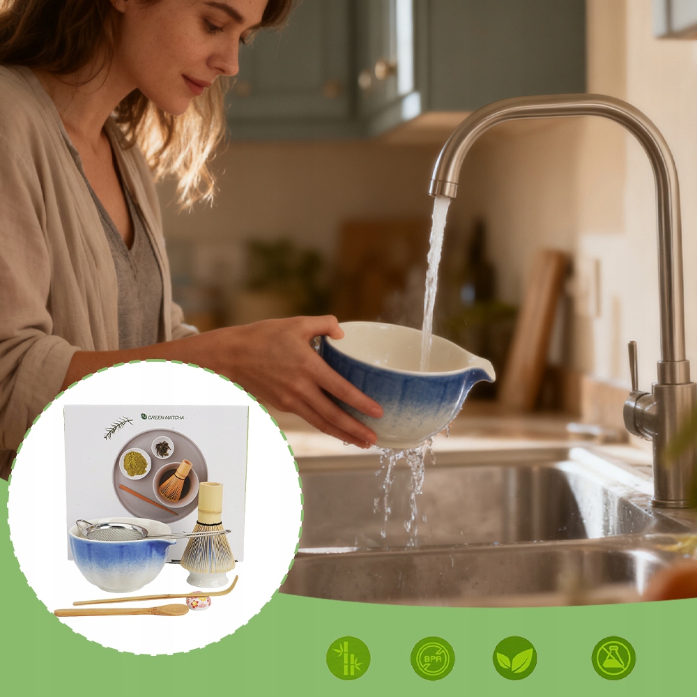 🧩- Чаша и подставка для венчика изготовлены из высококачественной глазурованной керамики, а венчик и ложка изготовлены вручную из натурального бамбука, который не содержит свинца и BPA, что обеспечивает безопасность пищевых продуктов.