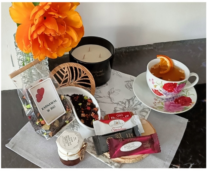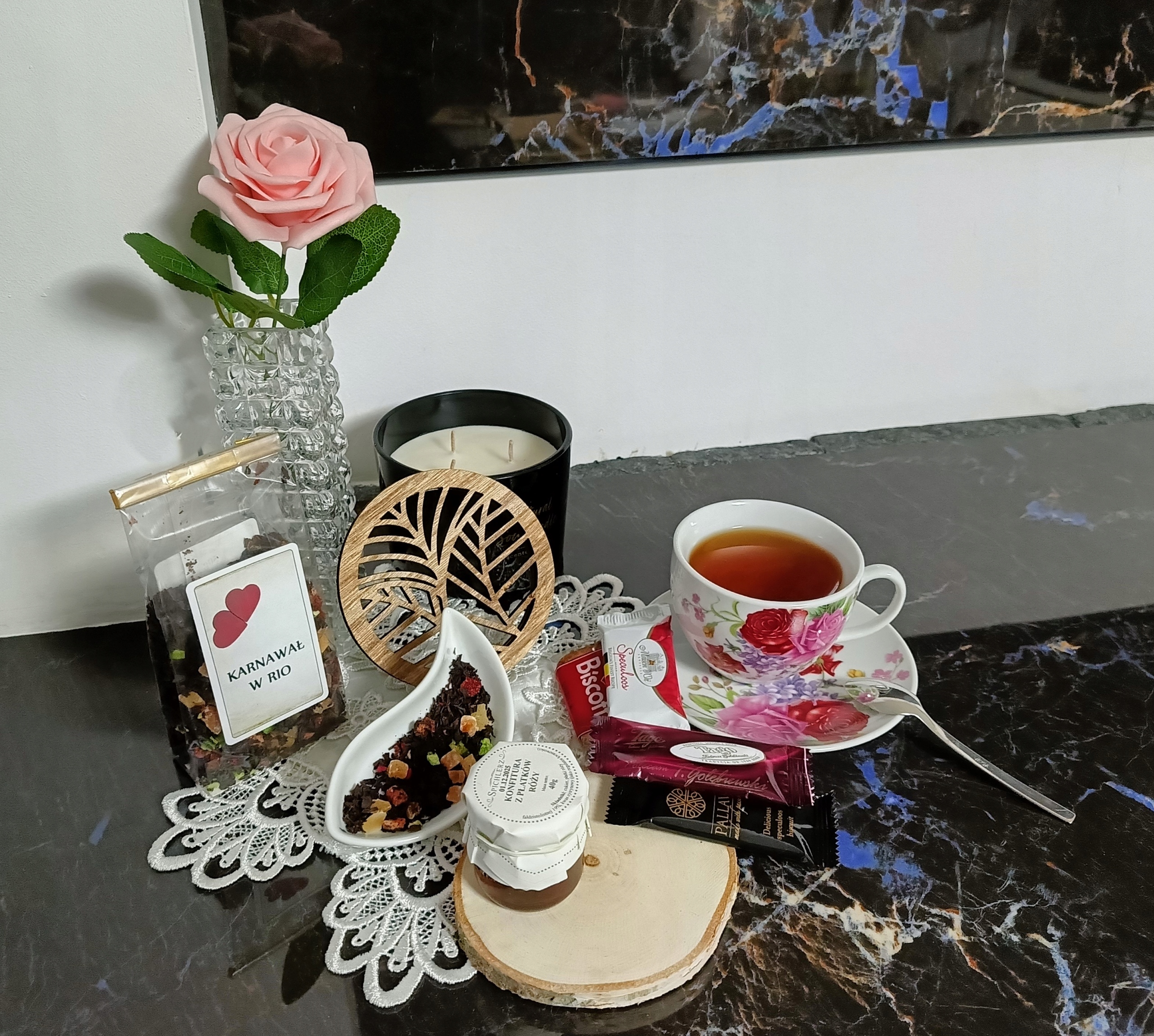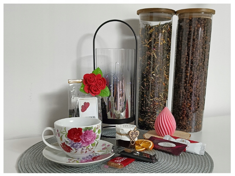 В наш набор входит красивая чашка объемом 250 мл, 50 г чая с выбранной плантации, 40 г домашнего джема и вкусное печенье с нотками специй. плюс тонкий декор и наполнитель - ароматная древесная шерсть. Все помещено в прочный фасадный короб с окном.