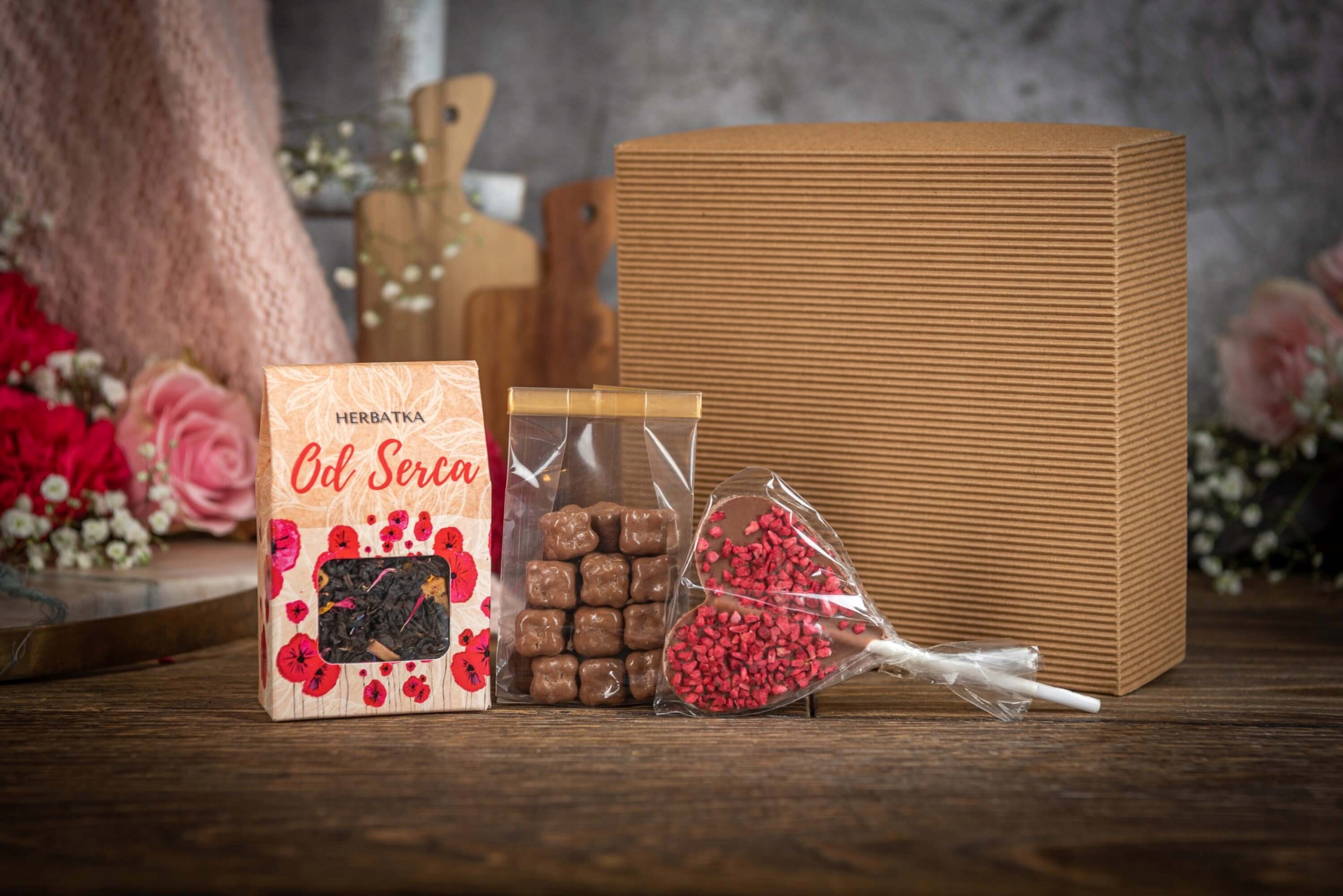 Натуральный подарок в виде хорошего чая, шоколадного леденца и кокосовых кубиков в шоколаде