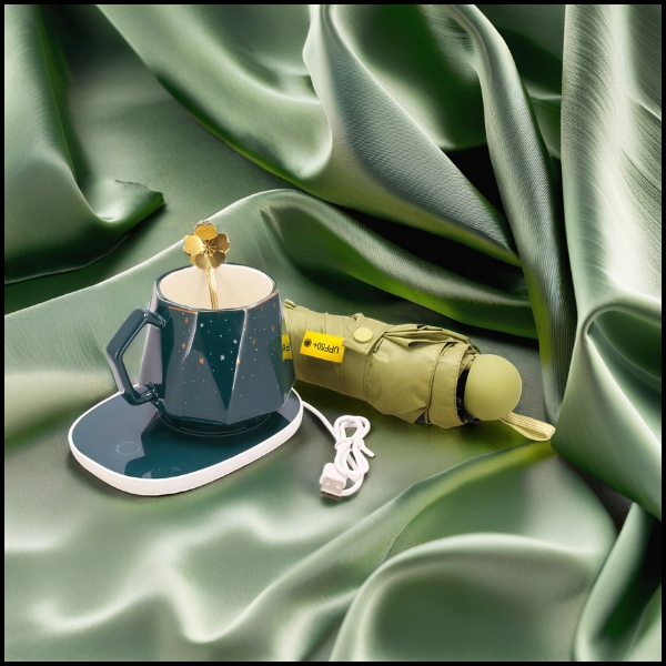 Подарочный набор создан с учетом гармоничного и эстетичного внешнего вида, благодаря чему все элементы - кружка, ложка, зонтик и грелка - создают сплоченную и элегантную цветовую композицию.